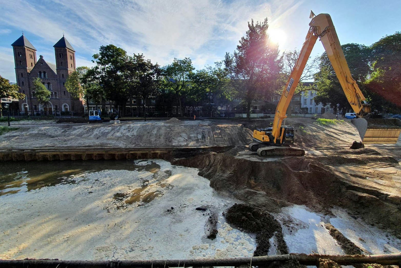 Op 12 september moet het werk klaar zijn. Er zou eigenlijk een groot feest komen, maar dat is voorlopig uitgesteld vanwege de coronamaatregelen. Wie de singel nog even zonder water wil zien moet snel zijn, want er wordt al flink gegraven. Het gedeelte tussen de Marga Klompébrug en de huidige singel stroomt al vol met water.