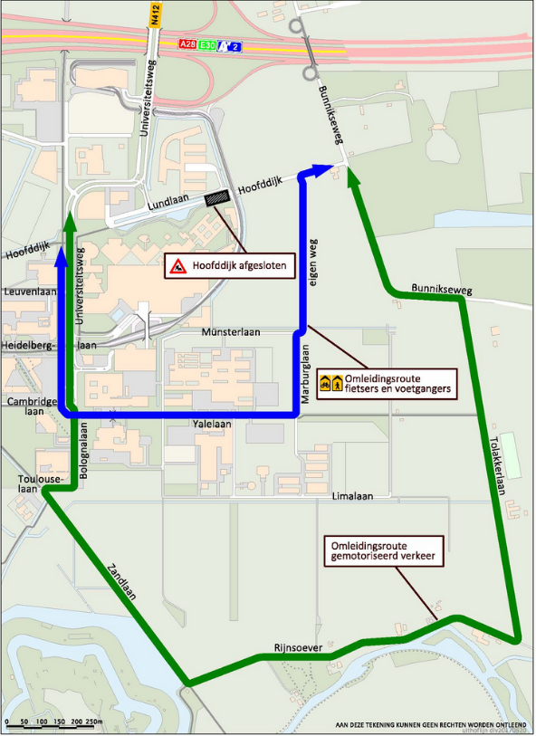 Fietsers en voetgangers worden omgeleid via een eigen weg van de faculteit Diergeneeskunde van de Universiteit Utrecht (zie blauwe lijn op het kaartje). Gemotoriseerd verkeer wordt verder omgeleid (zie groene lijn op het kaartje).