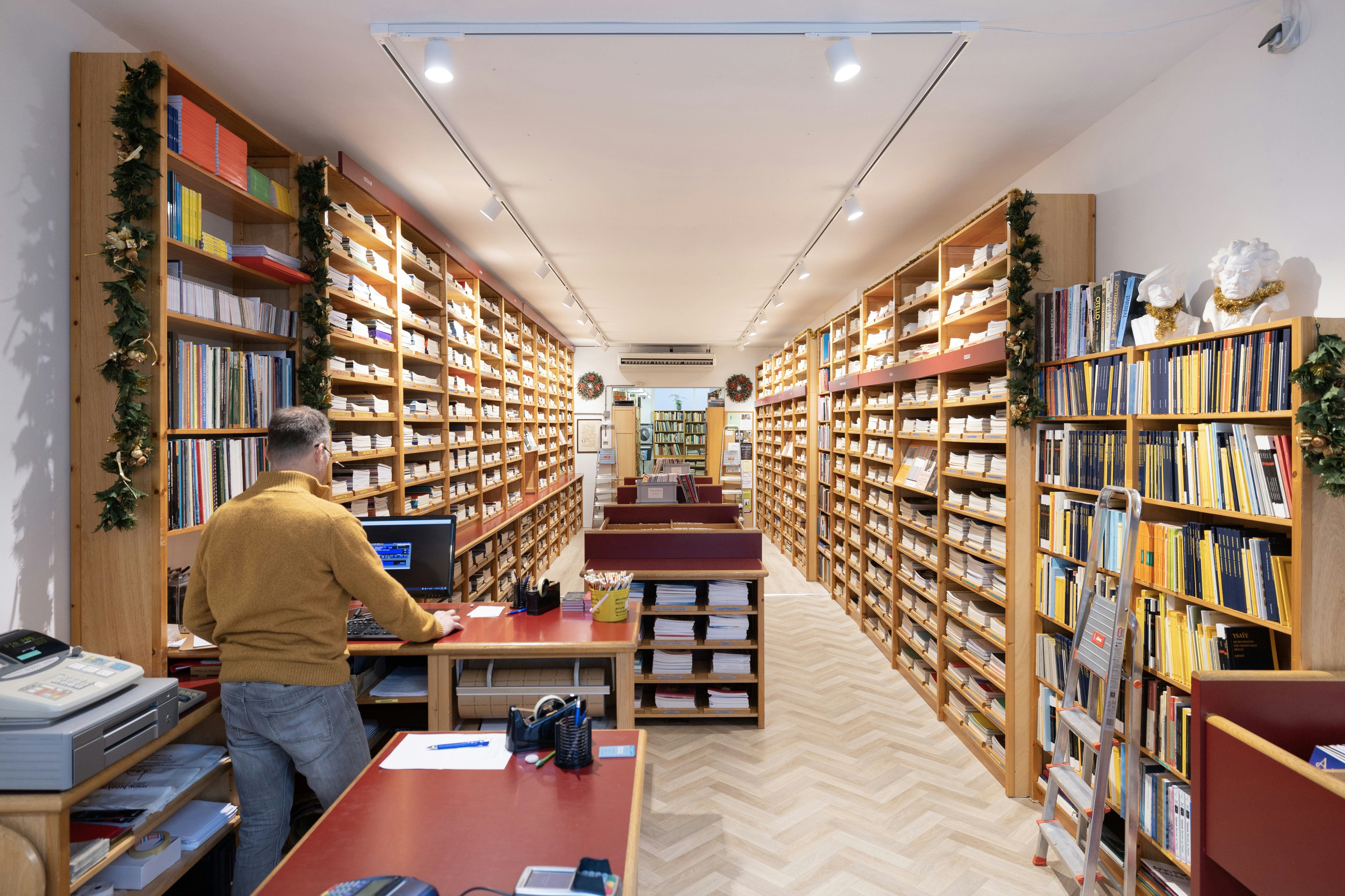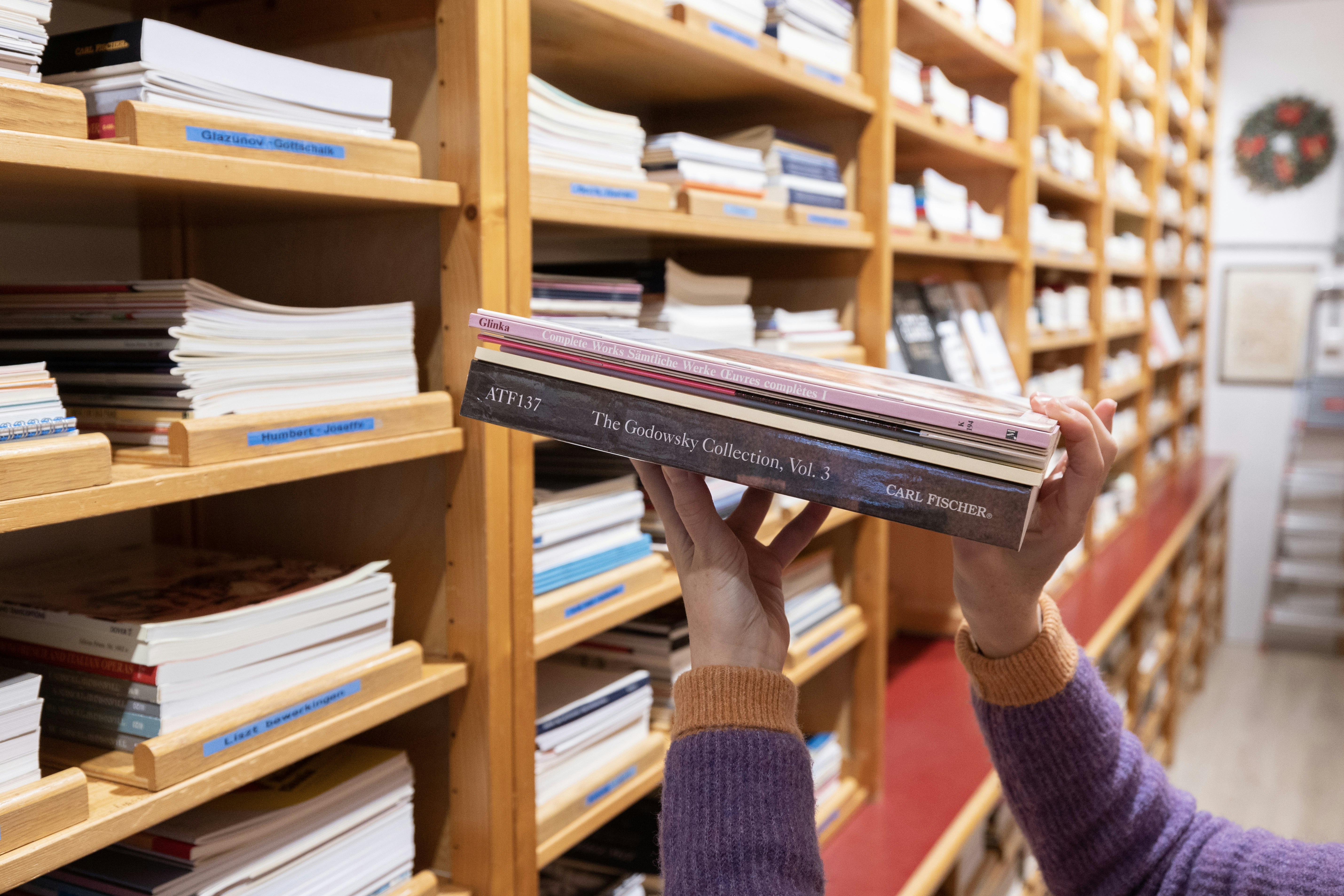 Voor in de zaak vind je alle nieuwe bladmuziek, achterin is een tweedehandsafdeling. In beide gedeeltes liggen de boekjes per instrument en genre keurig gesorteerd. Ieder stapeltje ligt op een kleine houten plank. Daarmee kunnen klanten gemakkelijk het stapeltje uit de kast trekken om vervolgens op de tafel in het midden beter te bekijken. Dat komen niet alleen Nederlandse musici doen, maar musici uit heel Europa, vertelt Dinant. Want bladmuziekwinkels zijn zeldzaam geworden.