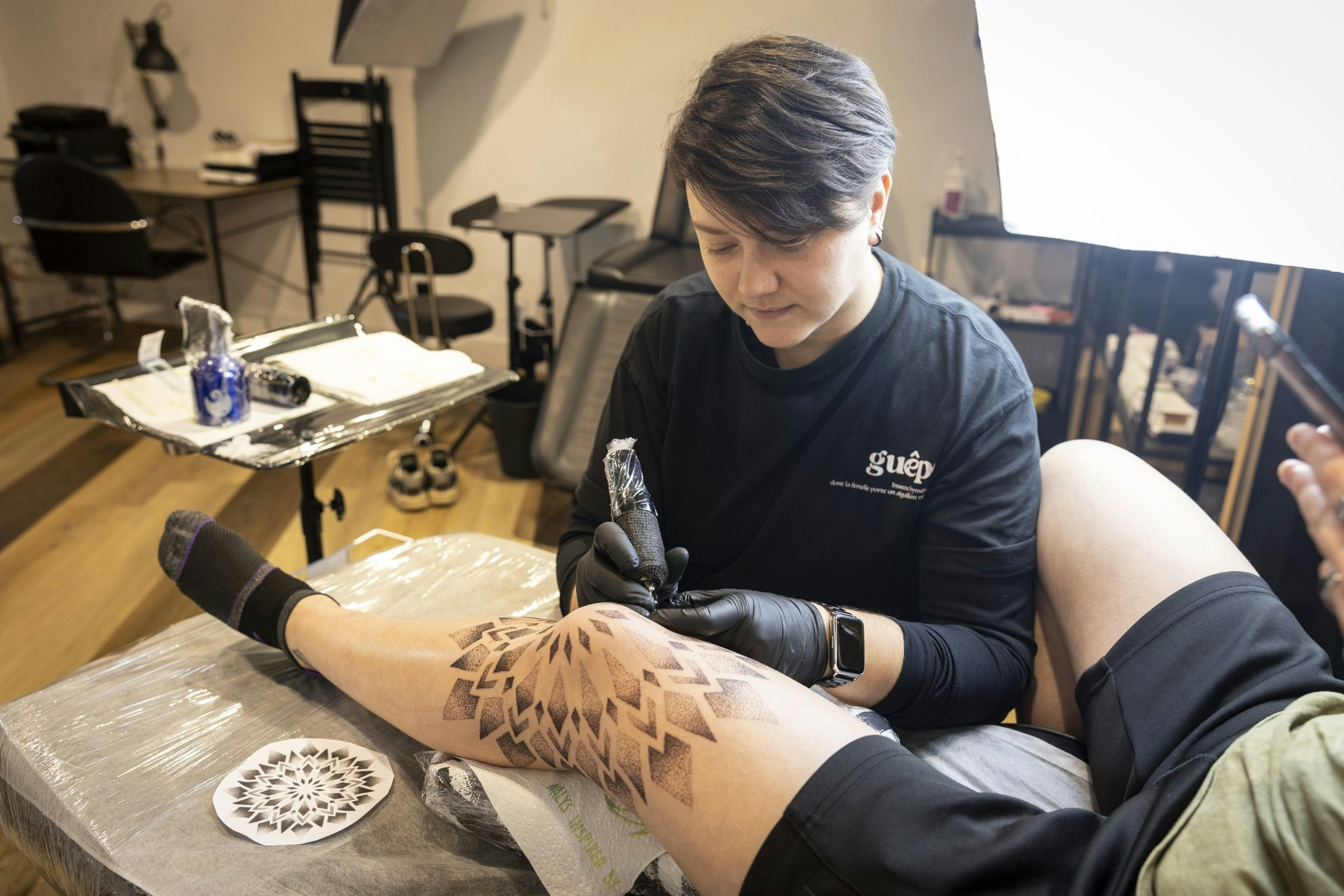 Binnen klinkt er Oekraïense muziek door de speakers. Er staan twee grote zwarte leren stoelen. Een van die stoelen staat achter een zwart kamerscherm. Op de knie van een klant is de Oekraïense Alla, een van de tatoeëerders, bezig met een tatoeage. Aan de muur hangt neonverlichting met teksten als ‘sorry mom’ en ‘now or never’. Het is er schoon en opgeruimd, iets wat manager Tetiana en de rest van het team erg belangrijk vinden.