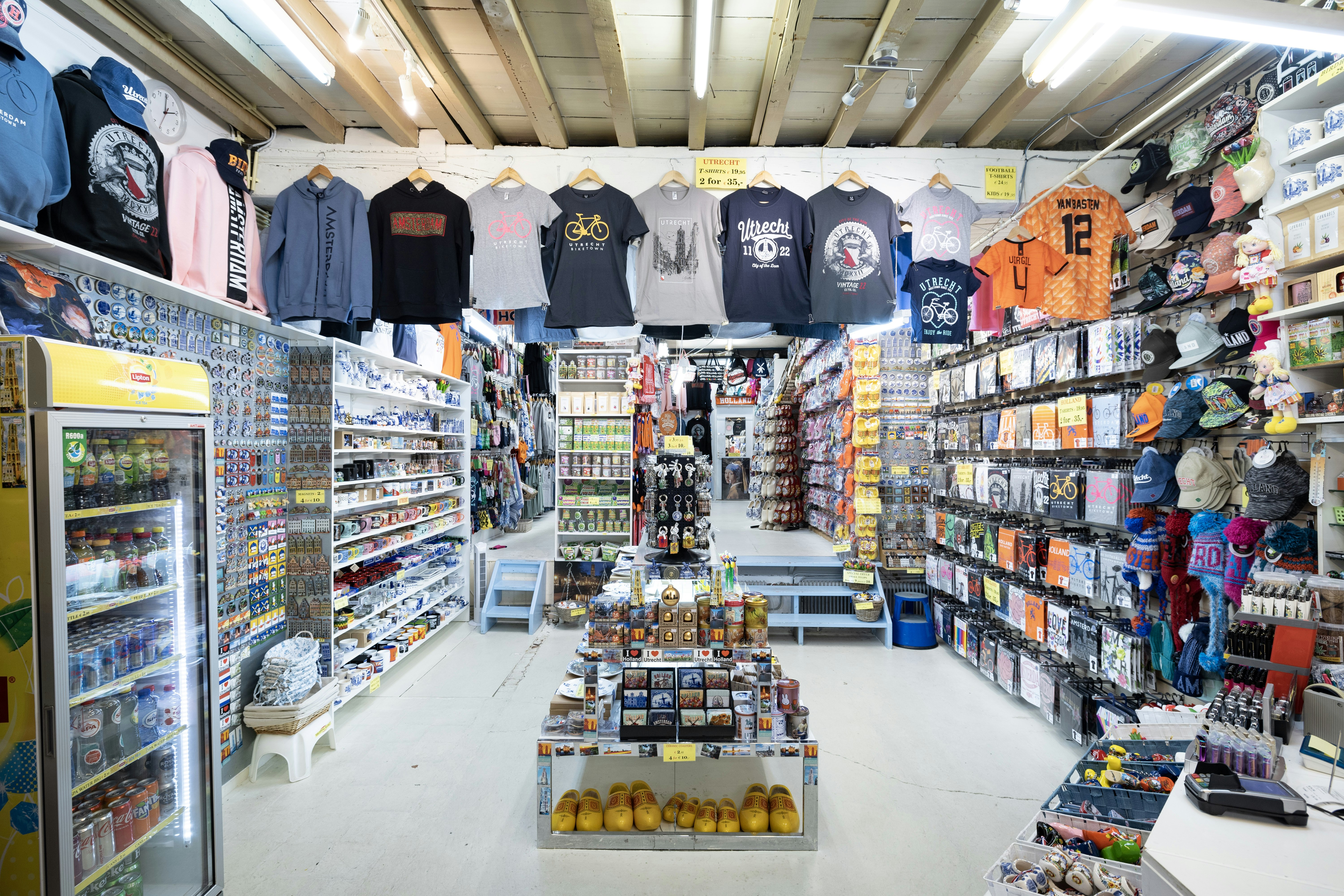 Koelkastmagneten, Dom-kaarsen, Nederlandse voetbalshirts, klompen, truien, houten tulpen, sokken met fietsen erop, stroopwafels, posters, sokken en nog veel meer. Er hangt en staat al van alles, maar Caspar wil zijn assortiment uitbreiden. Er komen volgens hem wat luxere dingen bij, zoals dinerborden en meer Utrecht-gerelateerde producten. Denk aan posters met foto’s van de Utrechtse skyline. Dingen die Utrechters als cadeau kunnen geven.