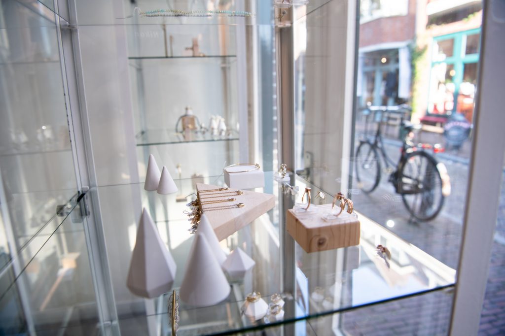 In het lichte, maar knusse pand is plek voor een paar vitrines, een toonbank, maar de meeste ruimte wordt toch wel ingenomen door hun werkbanken. Die liggen bezaaid met allerlei: van soldeerbrander tot hamer. En van tangen tot hier en daar een edelsteen en stukjes goud en zilver in verschillende vormen. Sommige dingen los, dan wordt en op dat moment mee gewerkt, andere keurig in kleine plastic zakjes.