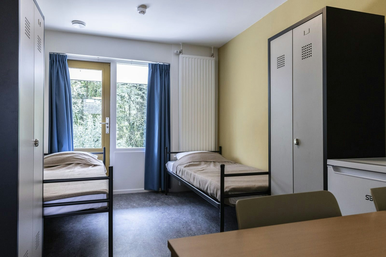De meeste slaapkamers bieden plek aan twee personen. Naast twee bedden staat er in iedere kamer een koelkast, een bureau en een kledingkast. Op beide verdiepingen is er een badkamer en toilet, die doen denken aan de sanitaire voorzieningen van een sporthal. Voor de begeleiders van de jongeren is een aparte hoek ingericht. Hier bevindt zich een kantoorruimte, twee kleine slaapkamers met ieder één bed en een aparte badkamer. Omdat er 24-uurs begeleiding is zijn er altijd minimaal twee medewerkers van het COA aanwezig in het huis en overdag zijn er straks meestal drie.