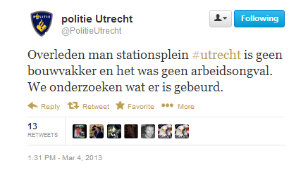 [politie.nl] Rond 12.15 uur kwam de melding dat op een bouwplaats aan het Stationsplein het lichaam lag van een man. Hulpdiensten kwamen ter plaatse, de man bleek echter al overleden. Op de plaats werd onderzoek verricht, het vermoeden is daar dat er sprake is van zelfdoding.