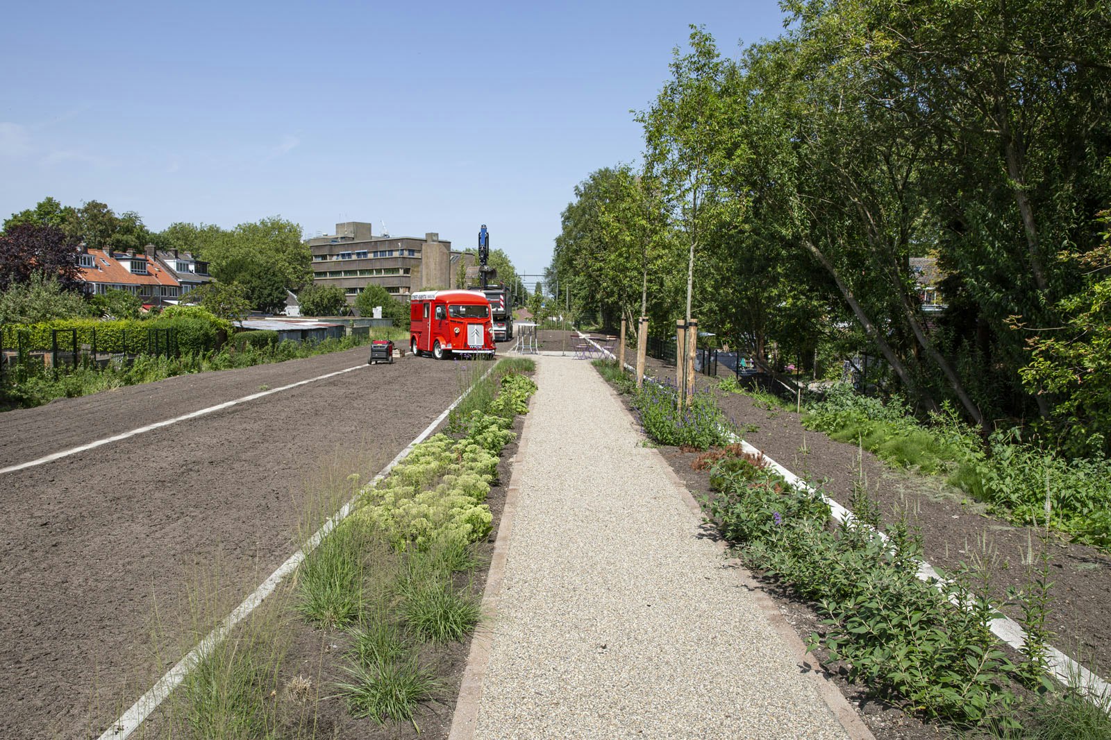 Oosterspoorbaan Zuid ziet er nu misschien nog niet zo groen uit, maar daar komt verandering in. De gedeeltes buiten het voetpad zijn ingezaaid met gras en andere planten en zien er binnenkort dus kleurrijk uit.