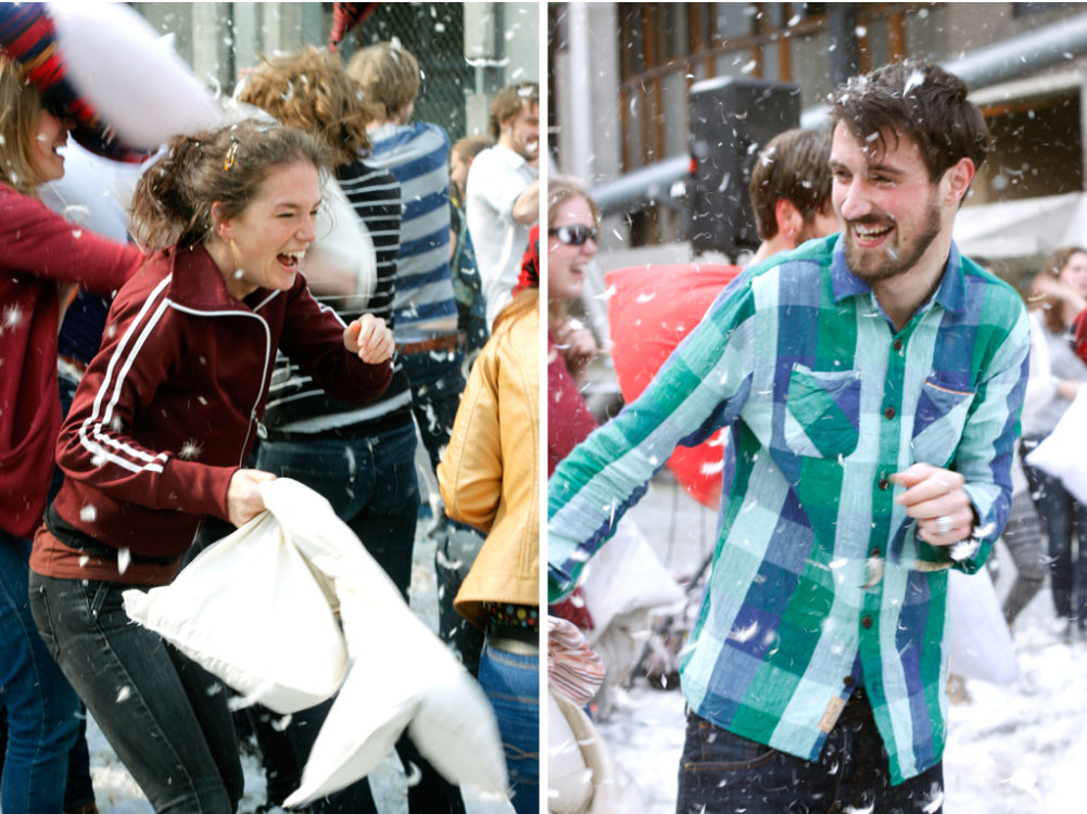 Pillow Fight Day in Utrecht. Zo’n 150 mannen en vrouwen stonden om drie uur op het Stadhuisplein met kussens in de aanslag. Doel? Lekker een kwartiertje geweldloos matten. Het resultaat: Vliegende veren, lachende gezichten en pluisjes in monden. Waarom? Just for fun! Is er een betere reden?