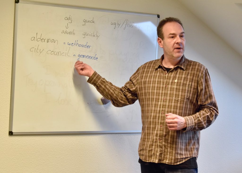 Goed, zo blijkt. In de les Engels die Van Ooijen bezoekt zitten deelnemers met allemaal verschillende achtergronden. Sommigen waren al begonnen met de cursus in Overvecht en willen de cursus hier afmaken, anderen wonen in het AZC. De les wordt besteed aan grammatica, maar bij binnenkomst van de wethouder wordt ook de kans gegrepen om wat toepasselijk vocabulaire te behandelen.
