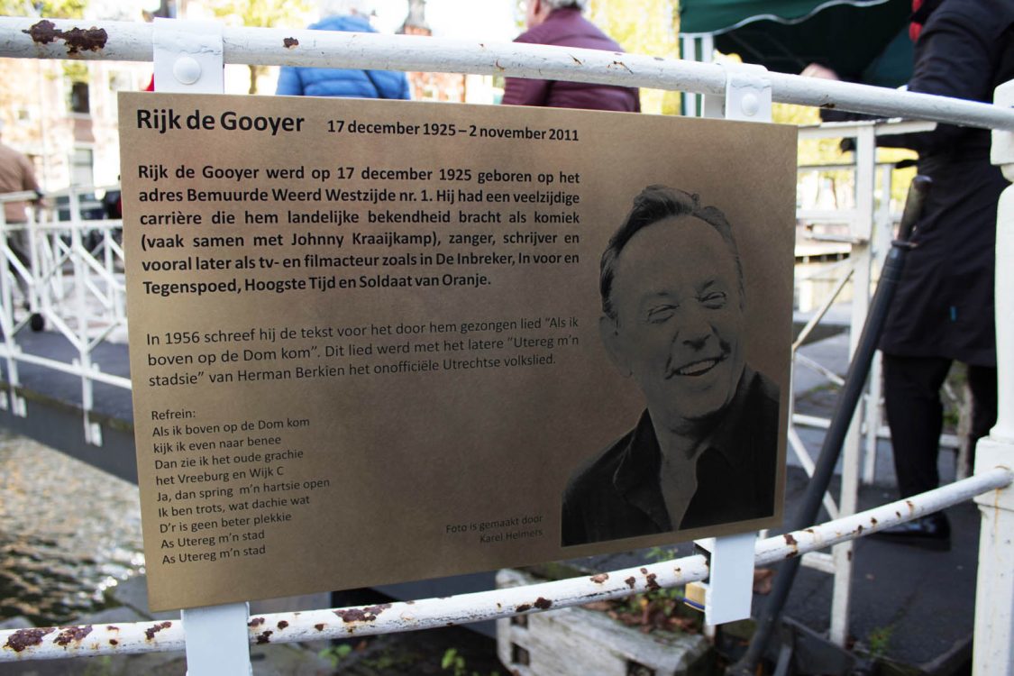 Ter ere van de Utrechtse artiest Rijk de Gooyer werd gisteren een plaquette onthuld. Wethouder Kees Diepeveen en Rijk de Gooyer jr. presenteerde het gedenkteken bij de Bemuurde Weerd, vlakbij het geboortehuis van De Gooyer sr.