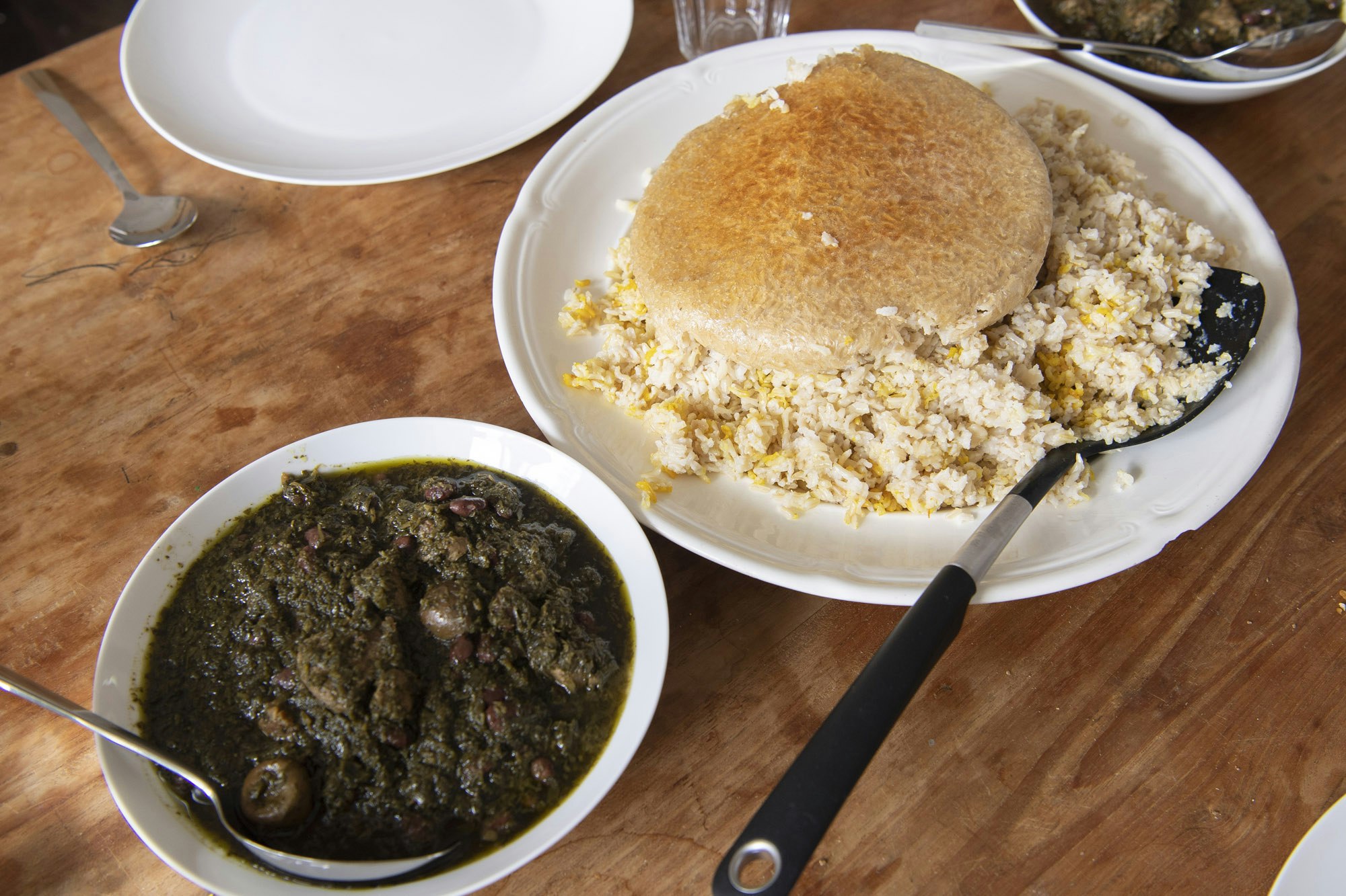 Schep met een brede spatel de rijst uit de pot en zorg ervoor dat de korst (tadig) die zich op de bodem van de pot vormt, niet wordt verstoord. Laat de saffraan wellen in een beetje water en giet over de rijst, roer erdoor. Serveer de rijst op een platte serveerschaal en vorm deze in de vorm van een piramide. Draai de tadig op een platte schaal of snijd het in stukjes en serveer rondom de rijst.