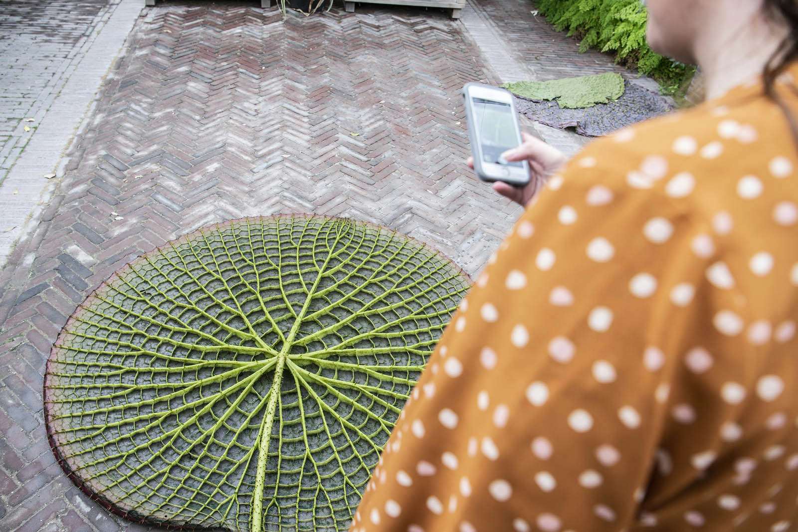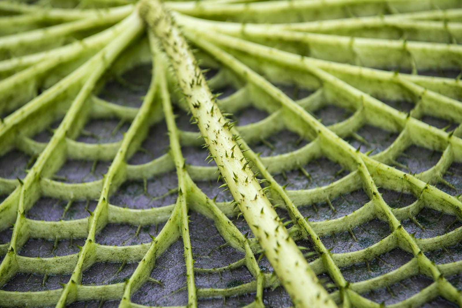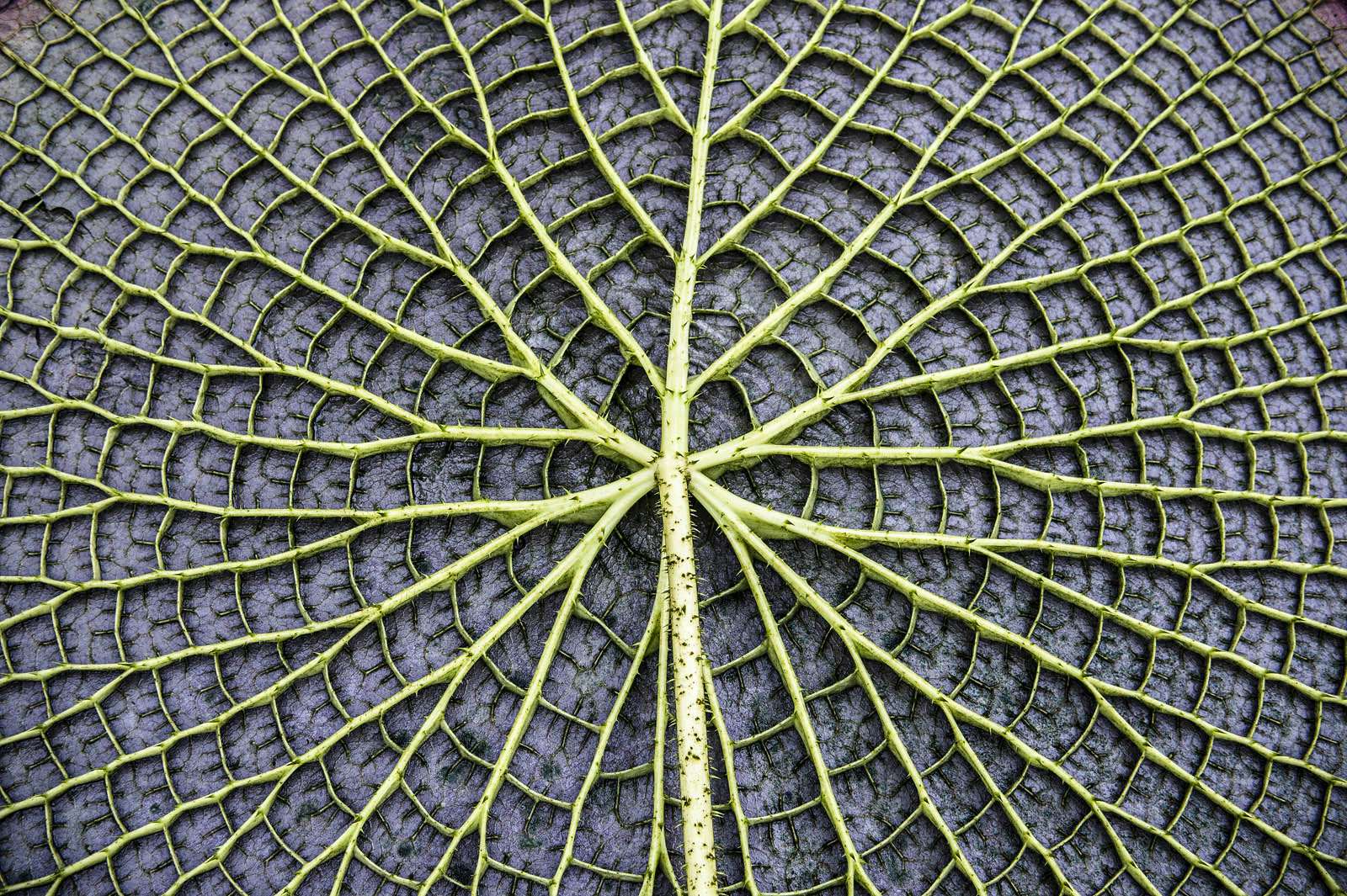 Om de groei van nieuwe bladeren te bevorderen wordt er af en toe een uit het water gehaald, dat gebeurde ook maandagochtend. Aan de onderkant van het blad van de waterlelie is goed te zien waardoor deze zo sterk is. De vlakken tussen de nerven zorgen ervoor dat er een soort luchtkussentjes onder de bladeren ontstaan, waardoor het zware blad kan blijven drijven.