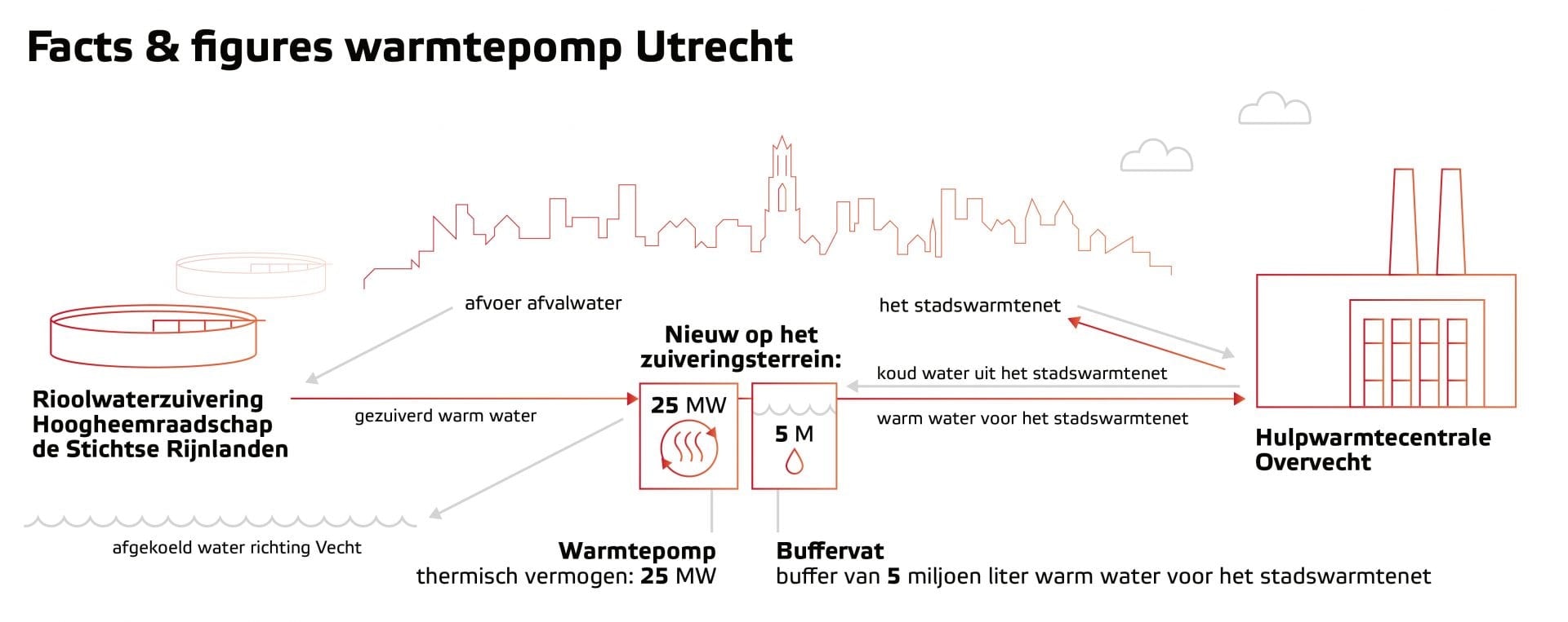 De bouw van de grootste warmtepomp van Nederland gaat dit jaar in Utrecht beginnen. Het gevaarte moet ruim 20.000 huizen gaan verwarmen met warmte uit afvalwater. De pomp komt op het terrein van de waterzuiveringsinstallatie in Overvecht.