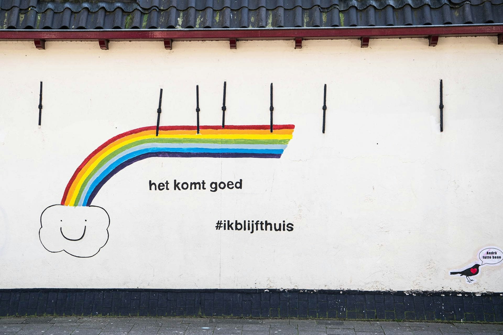 Een vrolijke regenboog met de woorden het komt goed en #ikblijfthuis. Heerdink vertelt: “Ik had gezien dat Italiaanse kinderen, die nu al veel langer thuis zitten, regenbogen hadden geknutseld met daarbij ‘Andrà tutto bene’. Dat betekent ‘het komt allemaal goed’.”