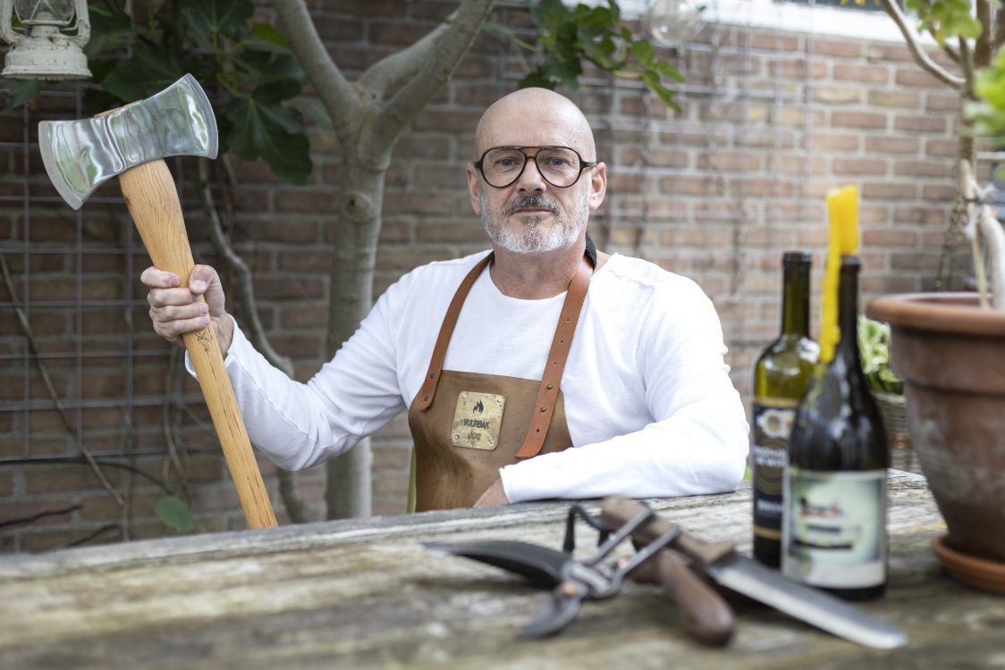 Jos heeft het eerste model van de Vuurbak prominent in zijn Utrechtse achtertuin staan, met een grillconstructie en een werkblad eraan gemonteerd. “Dit bij elkaar weegt ook wel richting de 100 kilo, dus ik schuif ‘m niet zomaar een stuk aan de kant”, lacht hij.