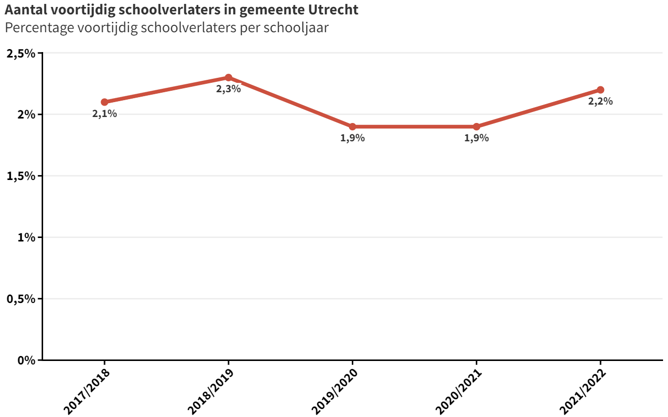 In Utrecht steeg het aantal schoolverlaters vorig jaar met 0,3 procent, van 1,9 procent naar 2,2 procent in schooljaar 2021-2022. Toch is er niet alleen slecht nieuws, meldt het Utrechtse college. Ten opzichte van vóór de coronaperiode, schooljaar 2018-2019 is het aantal schoolverlaters in Utrecht juist gedaald, met 0,1 procent. Dat komt volgens het college door de preventieve aanpak in Utrecht.