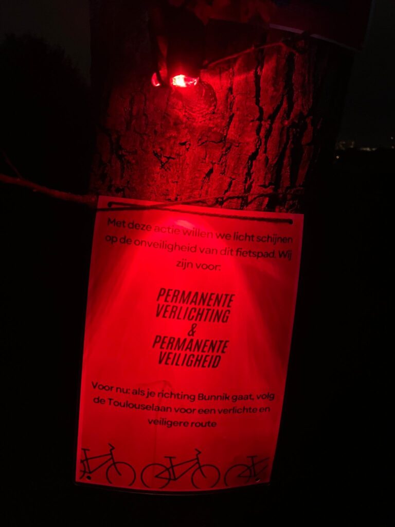 Op donderdagavond 9 oktober namen de studenten het heft in eigen handen en verlichtten ze zelf eenmalig het fietspad langs de Kromme Rijn. Jasmijn Jaquet, een van de initiatiefnemers, benadrukt dat deze actie bedoeld is om aandacht te vragen voor alle vrouwen – en anderen – die zich onveilig voelen en te maken krijgen met seksueel geweld.