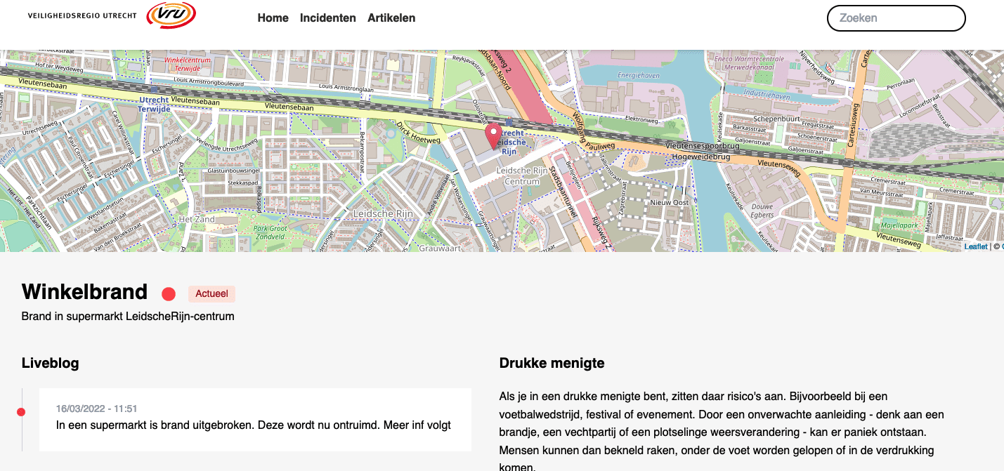 Vandaag verschijnen er weer berichten. Zo zou er een grote brand zijn in een supermarkt in Leidsche Rijn Centrum, de winkel wordt ontruimd en de weekmarkt op het plein moet daarom ook beëindigd worden. Op de website wordt ook gemeld dat er een chemische tank is opengescheurd in De Meern en dat een bijtende stof wegvloeit in omliggende kanalen. Op de pagina’s staat nergens gemeld dat het om een testomgeving gaat.