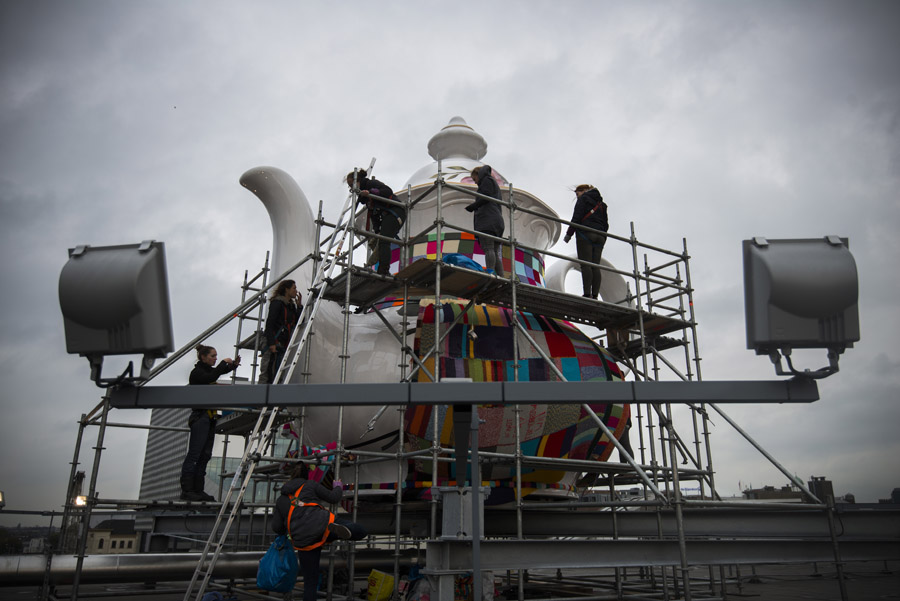 De bijna 7 meter hoge theepot die op de traverse van Hoog Catharine staat was al een kunstwerk maar hij wordt nu nog kunstiger. De theepot van kunstenaresse Lily van der Stokker, getiteld Celestial Teapot wordt op dit moment namelijk bekleed met wol. “De theepot had het koud”, laat Katia Lucas van Decodel weten.