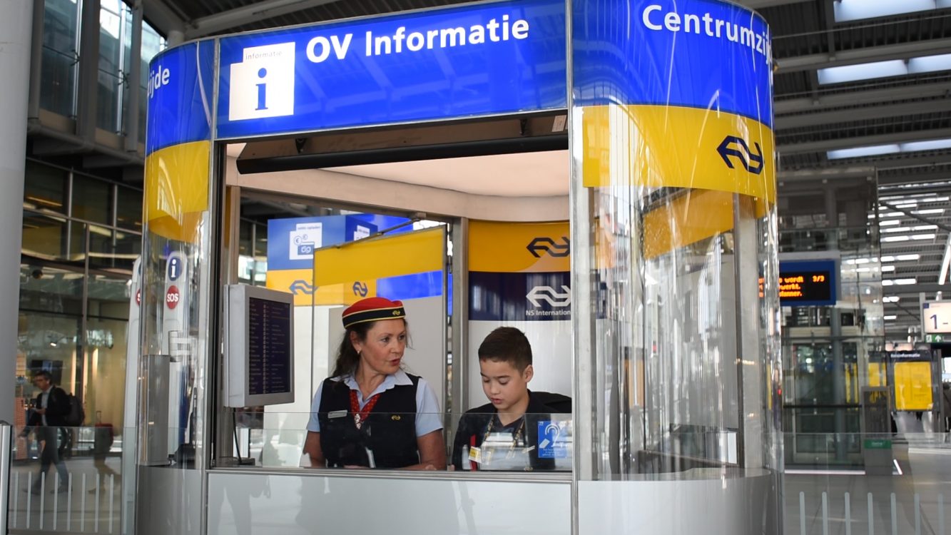 Ter gelegenheid van de Spoorwensdag, dat ieder jaar door de NS wordt georganiseerd, liep Thomas (9) woensdag mee bij de NS. Op station Utrecht Centraal mocht hij de informatiebalie bemannen. Geen vraag was te moeilijk, want Thomas kent het hele spoorkaart uit zijn hoofd.
