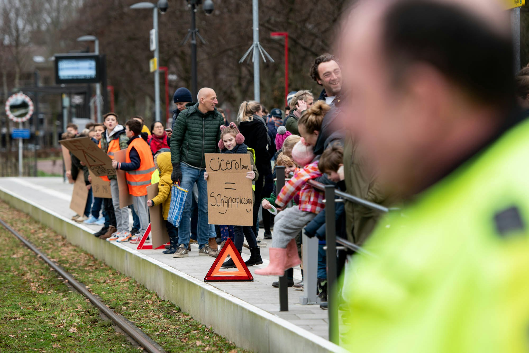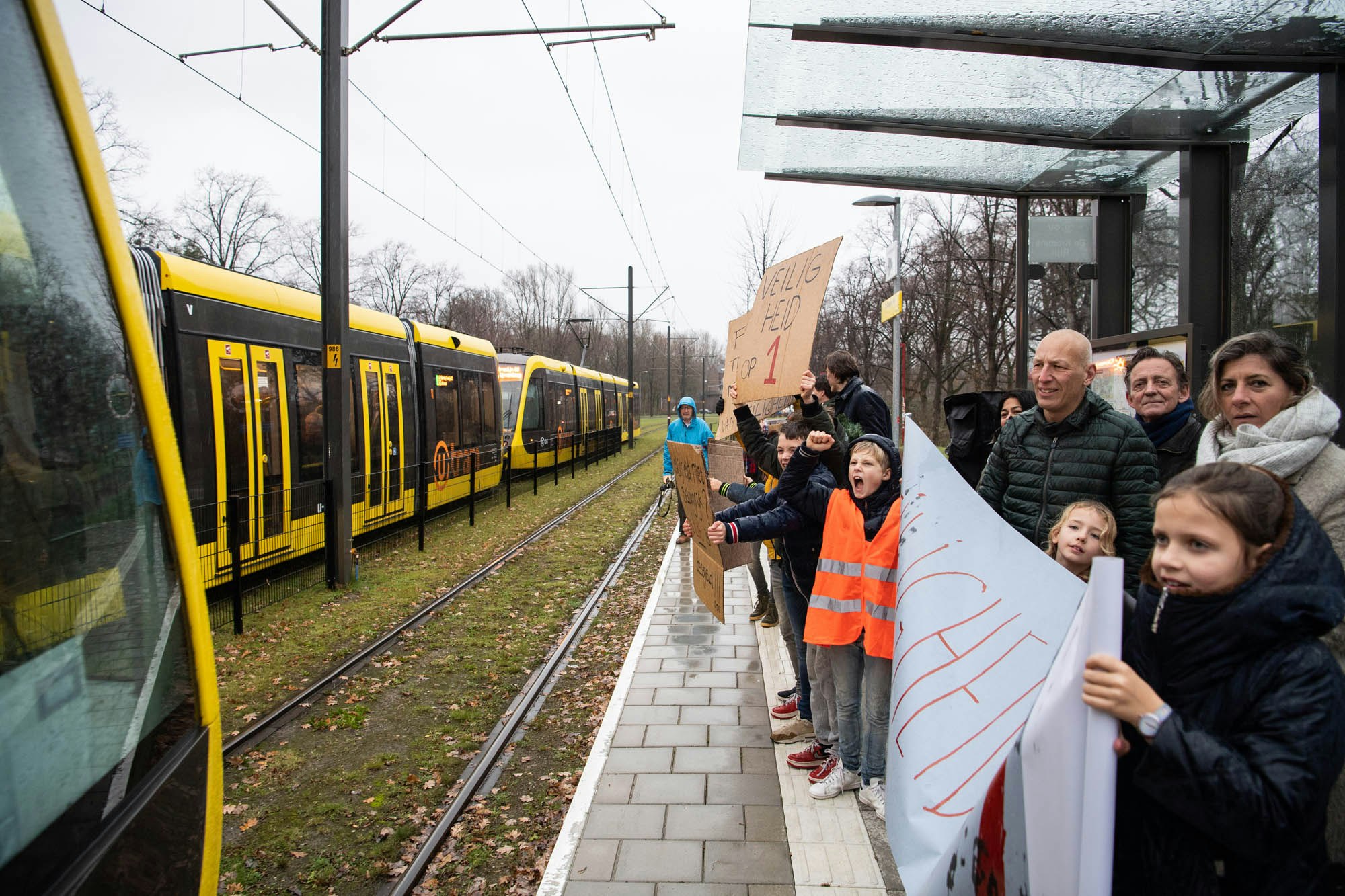 De demonstranten, veelal ouders met kinderen, stonden met spandoeken en borden de eerste tram op te wachten. Inzittenden van de tram werden toegesproken over de in hun ogen onveilige situatie.
