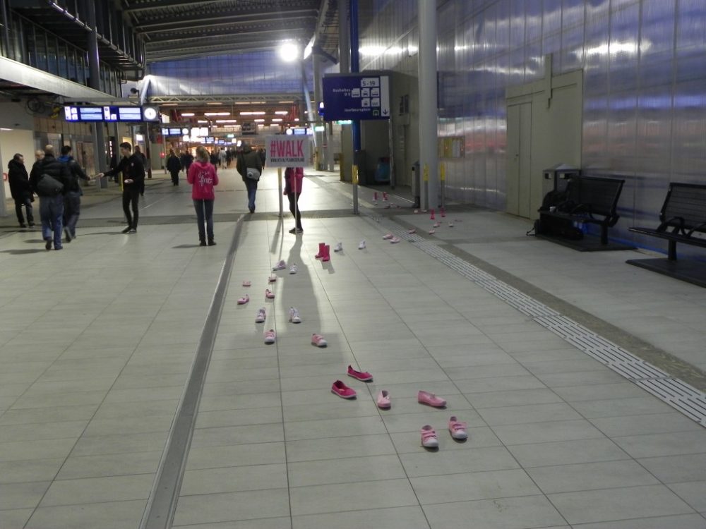 Er waren tientallen roze schoenen te vinden op Utrecht Centraal Station vanochtend. Verspreid door de hal stonden de lege schoenen. De actie, opgezet door studenten van de Hogeschool voor de Kunsten in Utrecht, markeert de start van de jongerencampagne The Road To Happiness van Plan Nederland.