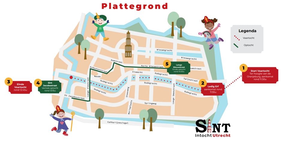 De Sint vertrekt om 13.15 uur vanuit de Sint Jacobsstraat voor een optocht door de stad. Via de Lange Viestraat, Neude, Schoutenstraat, het Oudkerkhof en de Domstraat komt de optocht om 13.55 uur het Domplein op. Omdat daar dit jaar dus geen evenement is, vertrekt de optocht gelijk weer naar de Lange Nieuwstraat. Daar eindigt de intocht.