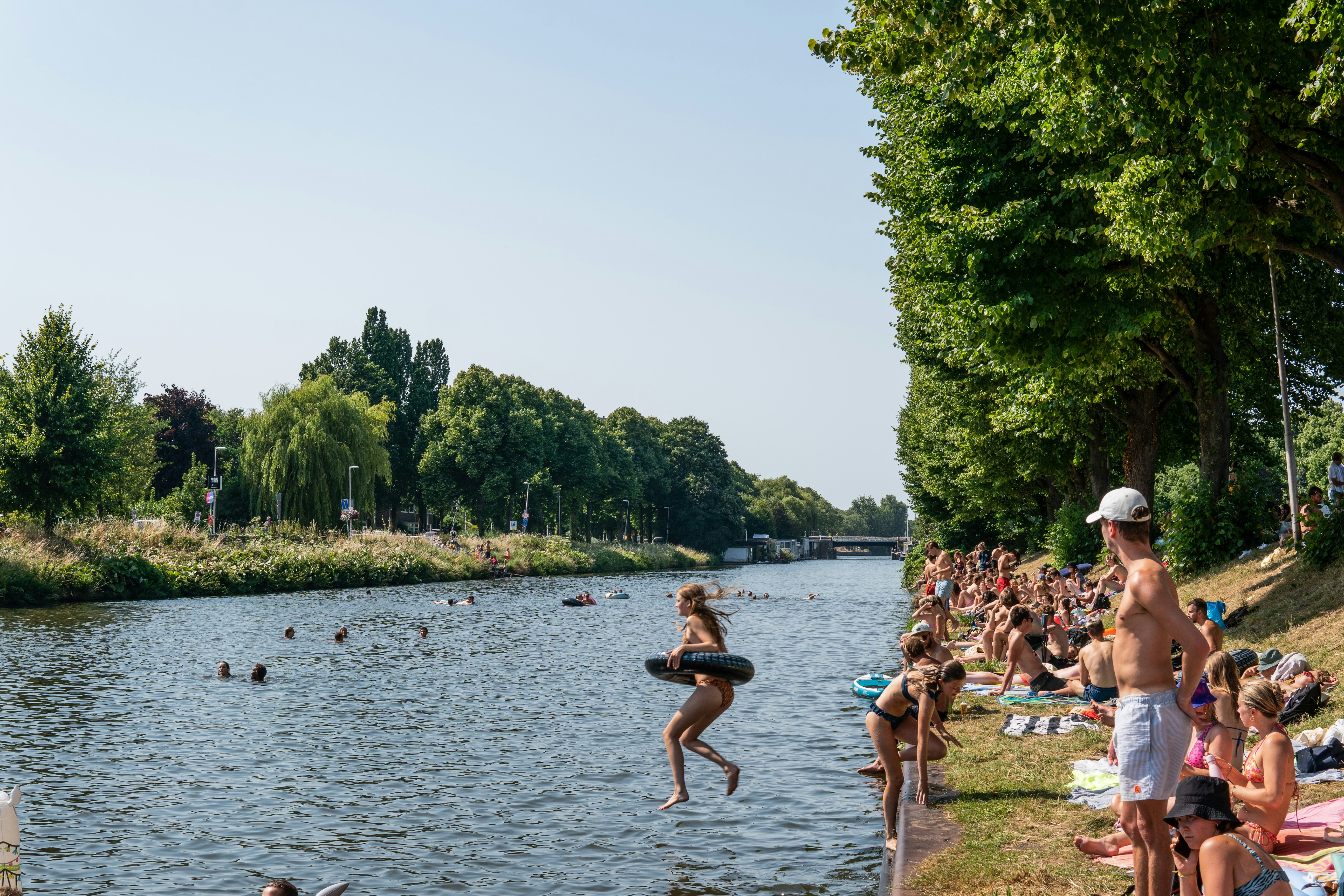 Op een handdoek aan het water, varend in een bootje of door een duik te nemen vonden veel Utrechters verkoeling. Veel officiële zwemplekken heeft Utrecht niet, maar met dit weer houdt dat lang niet iedereen tegen om ook op andere plekken het water in te gaan.