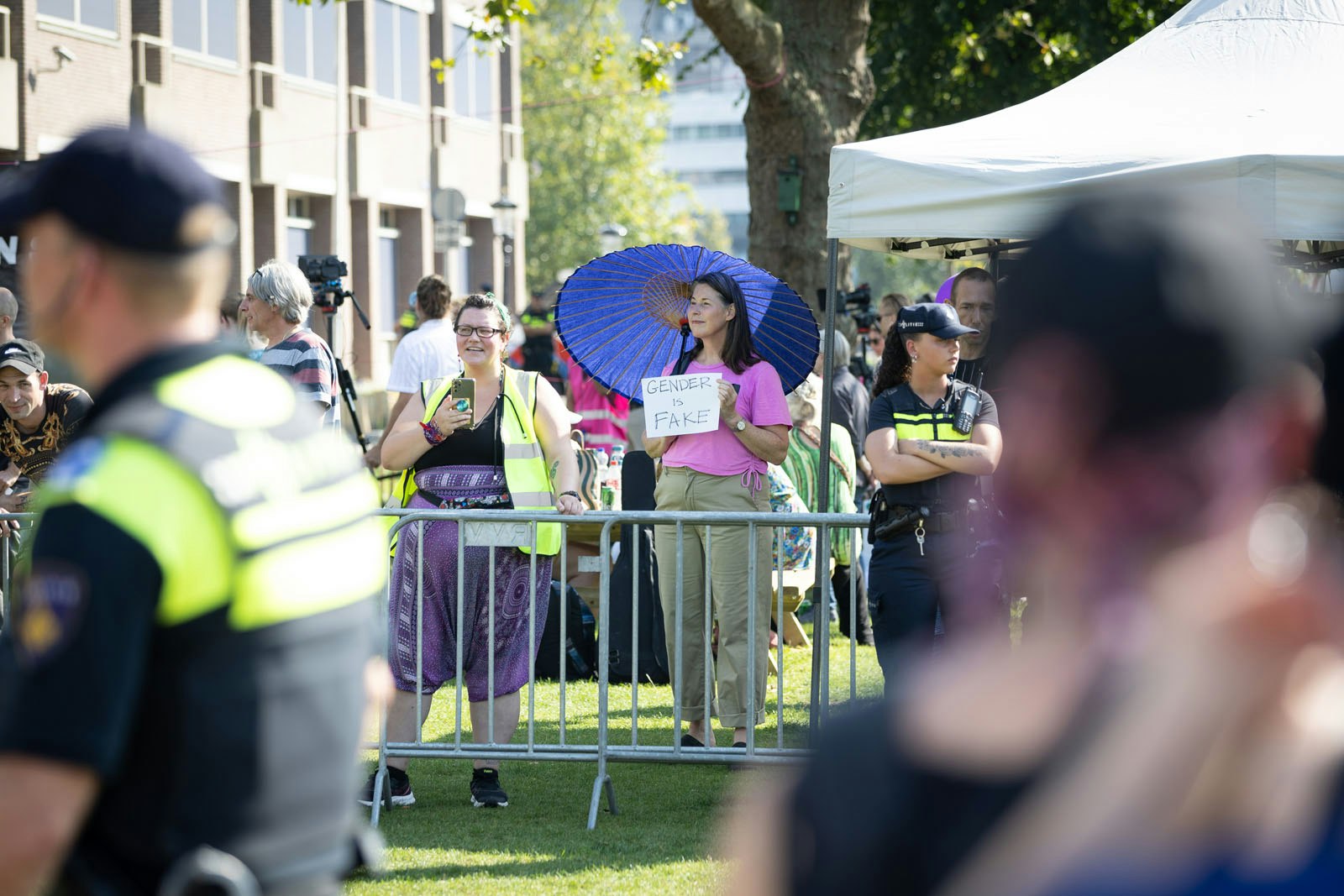 Twee groepen demonstranten stonden zaterdagmiddag letterlijk lijnrecht tegenover elkaar in Park Paardenveld in Utrecht. Aan de ene kant stonden de aanhangers van de Let Women Speak-bijeenkomst en daartegenover stond een groep die het niet eens was met deze boodschap.