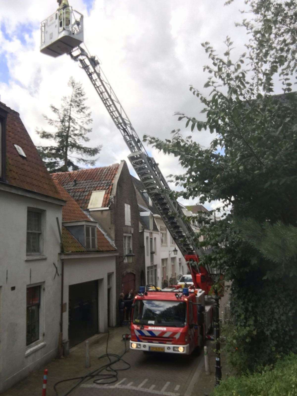 De brandweer is druk bezig met een uitslaande brand in de Nobeldwarsstraat in het centrum van Utrecht. De vlammen slaan uit een schuur van 15 bij 5 meter.