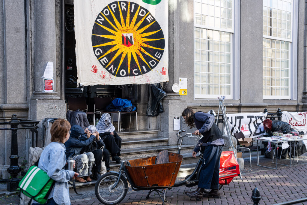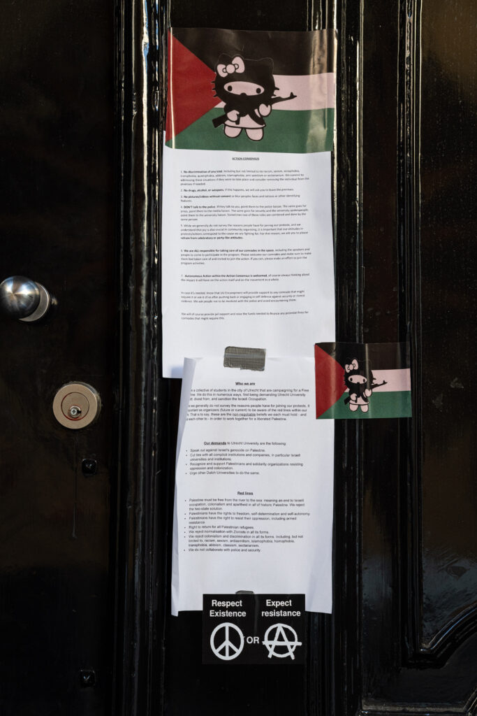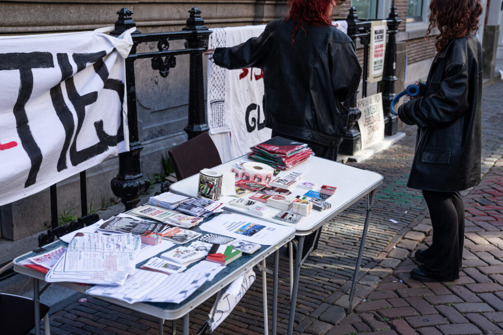 Dinsdagochtend is de sfeer in de straat gemoedelijk. Er wappert een spandoek en twee Palestijnse vlaggen. Twee demonstranten zetten tafels neer met daarop stickers en flyers met informatie over de actie, en pauzeren voor een kopje koffie. Drie andere demonstranten zitten in de ochtendzon op het trappetje bij de voordeur. Op de deur zelf zijn twee A4’tjes geplakt met daarop de eisen.