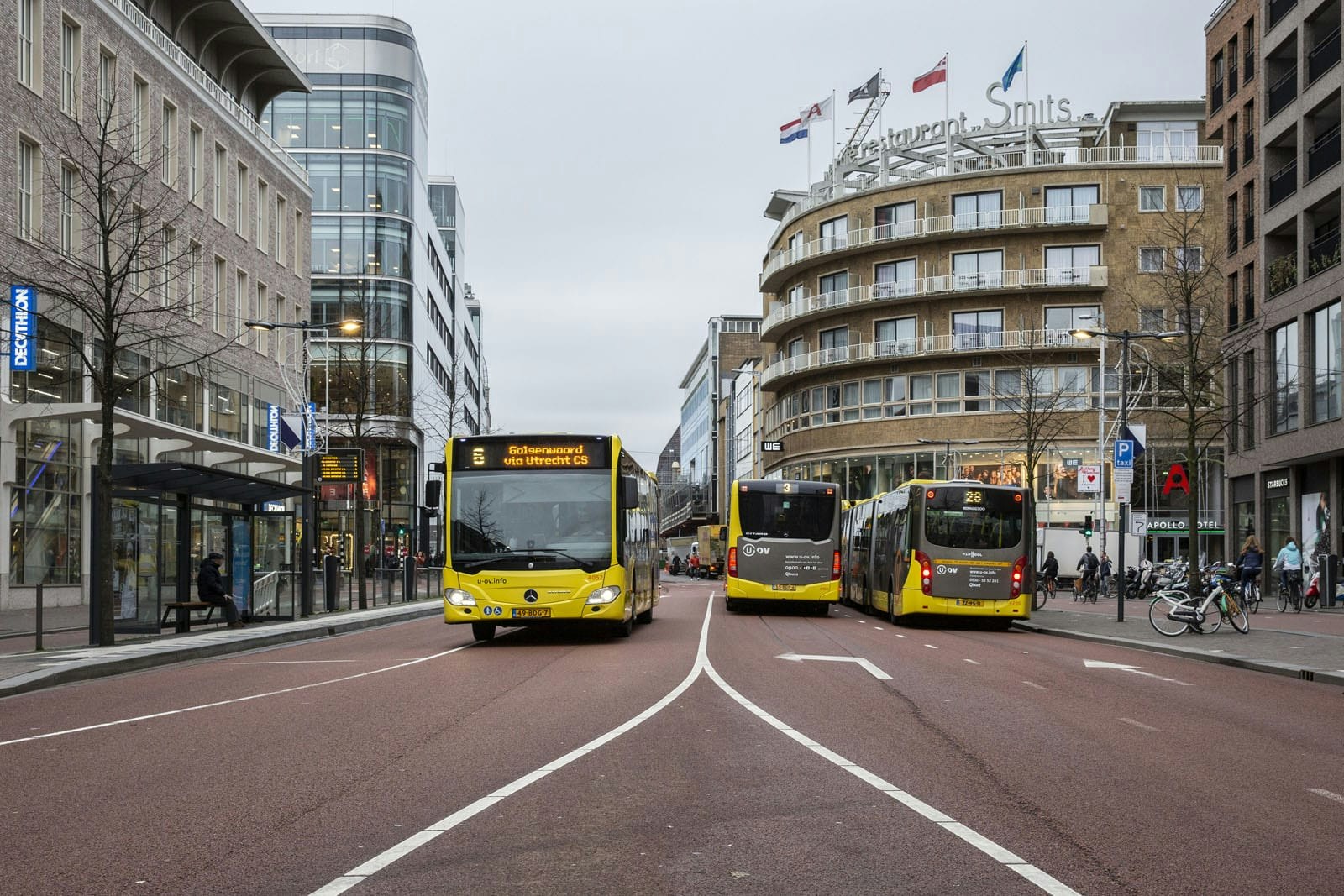 Zwart asfalt is vervangen voor rood asfalt met veel meer en veel grotere bussen.