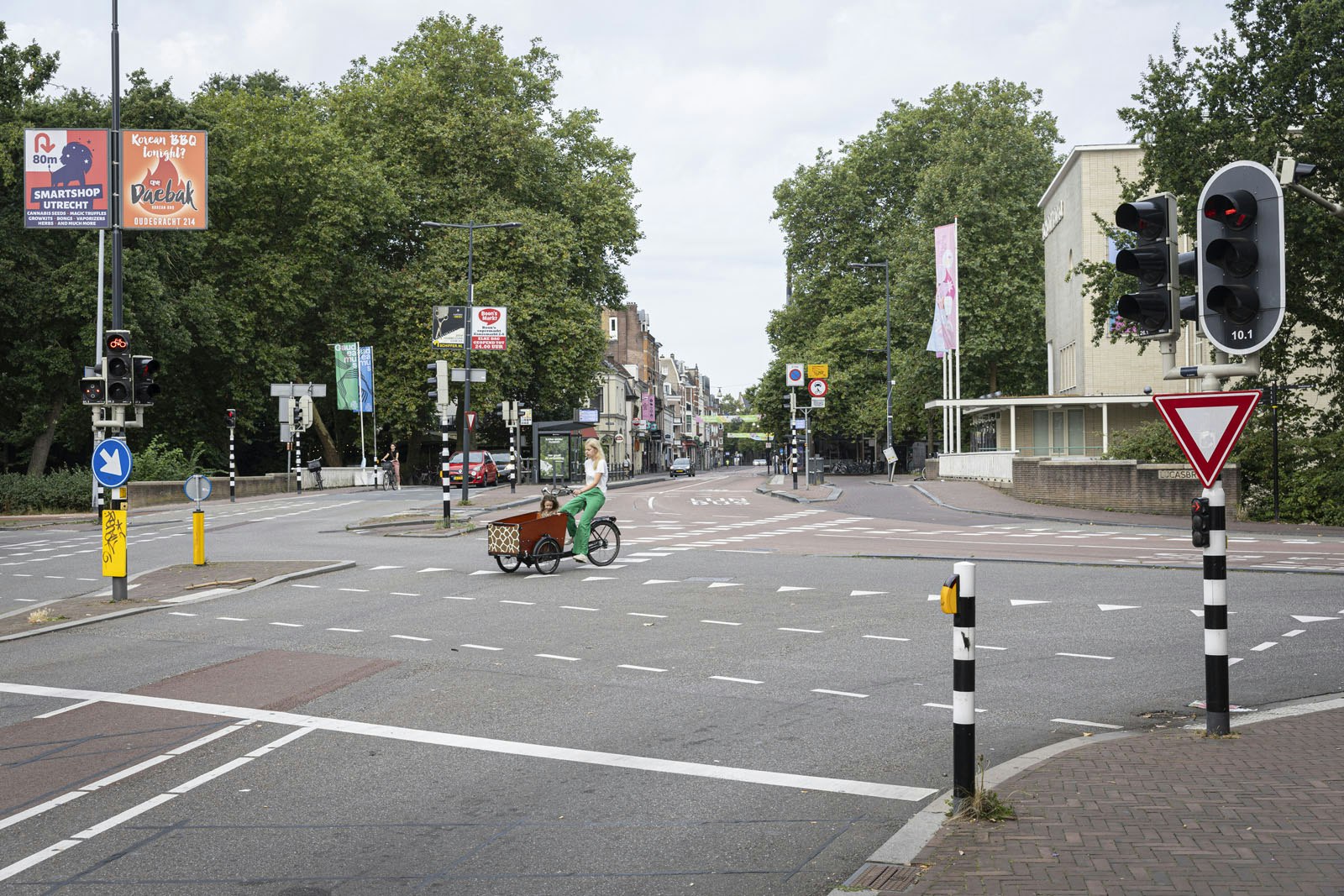 Interessant, die dame die met haar bakfiets dwars tegen het verkeer in over het kruispunt rijdt, puppy voorin. Illustratief voor de Utrechtse fietsersanarchie.