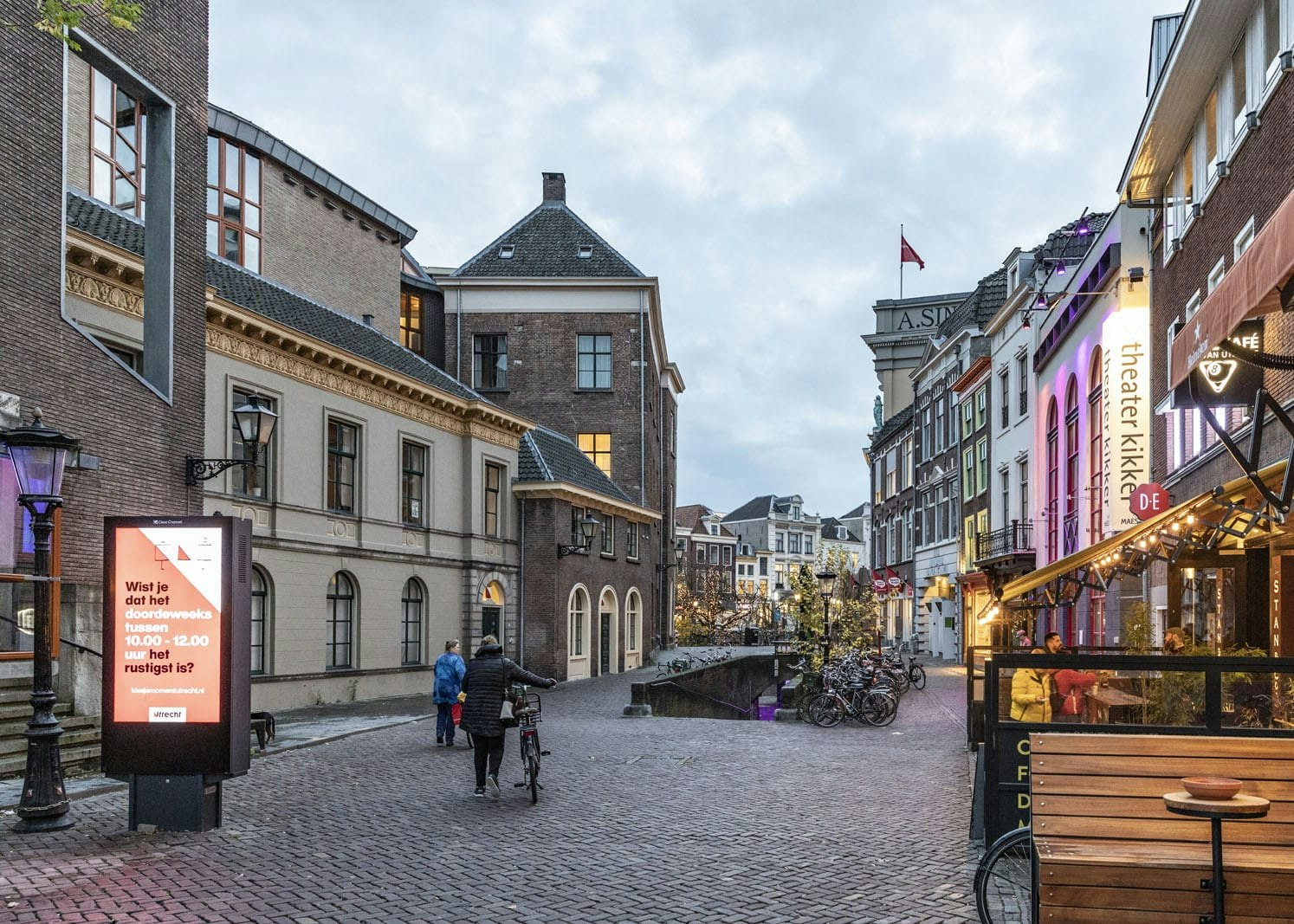 Sjezus, wat een verstoring, dat digitale reclamebord! En hoewel ik blij ben dat het Domplein geen parkeerplaats meer is, is horecaterrassen nou ook niet echt een fraaie vervanging.