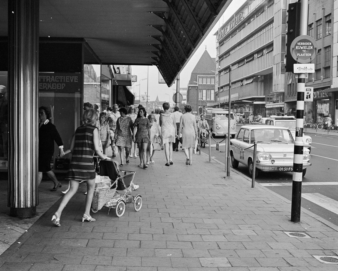 De dame met de kinderwagen wandelt net onder de luifel van Kreymborg door (hoek st. Jacobstraat) waar een “attractieve” uitverkoop wordt gehouden.