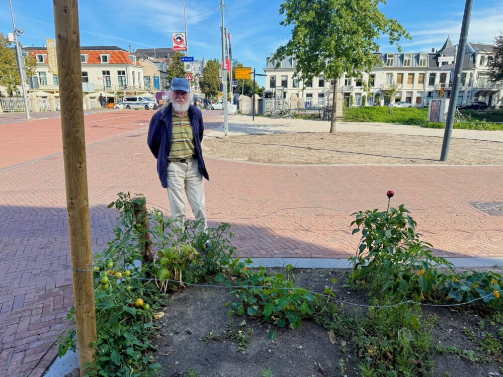 De 81-jarige Dirk Zoebl is in juni begonnen met het planten van de eerste groenten. Vanaf het terras geniet hij vaak, dit keer met een biertje in zijn hand, van het tafereel: voorbijgangers die even stilstaan, foto’s maken of met elkaar praten over de kleurrijke planten. Soms verdwijnt er zelfs een rijpe tomaat in een tas.
