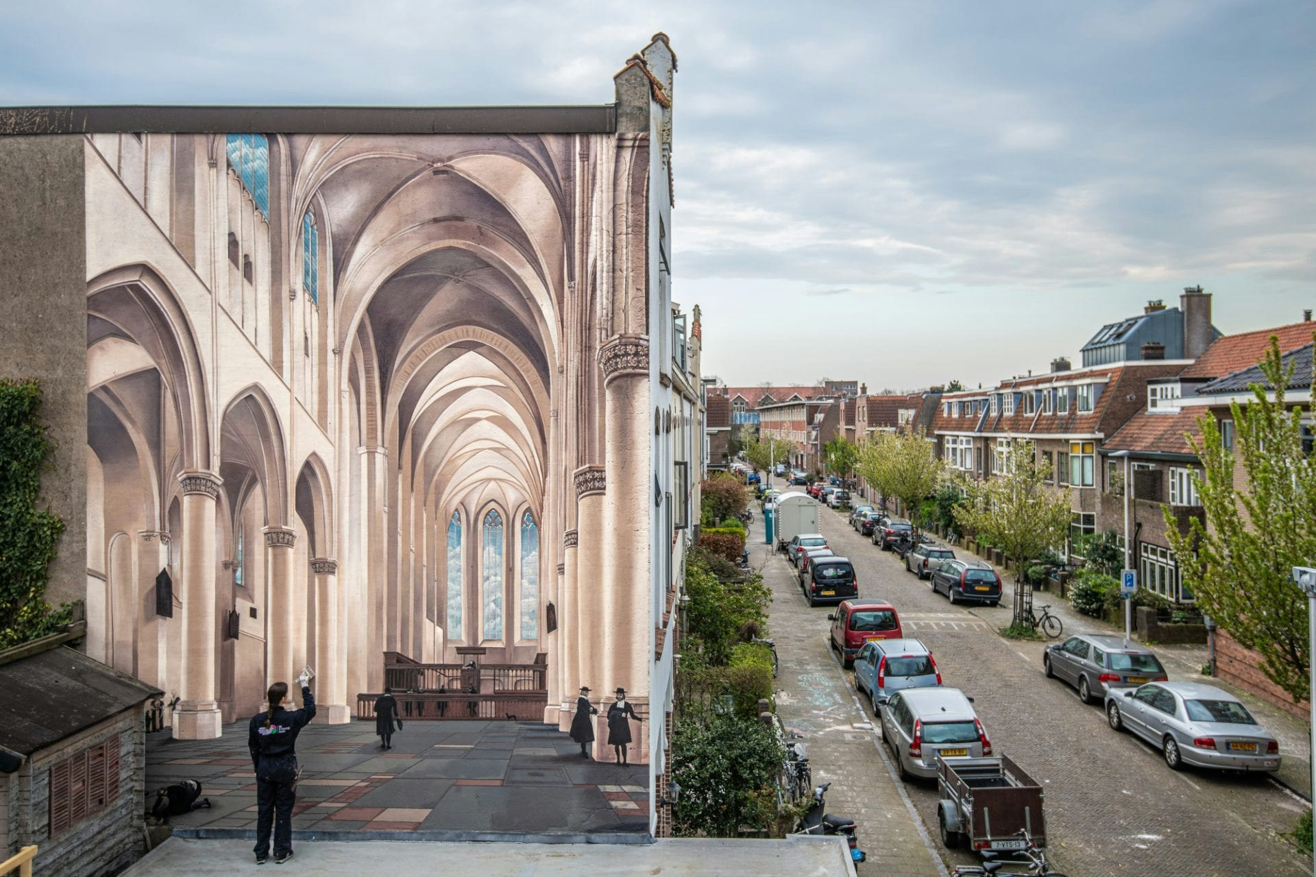 De lang gekoesterde wens van de buurt om de blinde zijmuur in de Saenredamstraat op te knappen is in vervulling gegaan en dat heeft een indrukwekkende muurschildering opgeleverd van De Strakke Hand. Het werk toont het interieur van de Catharijnekerk.