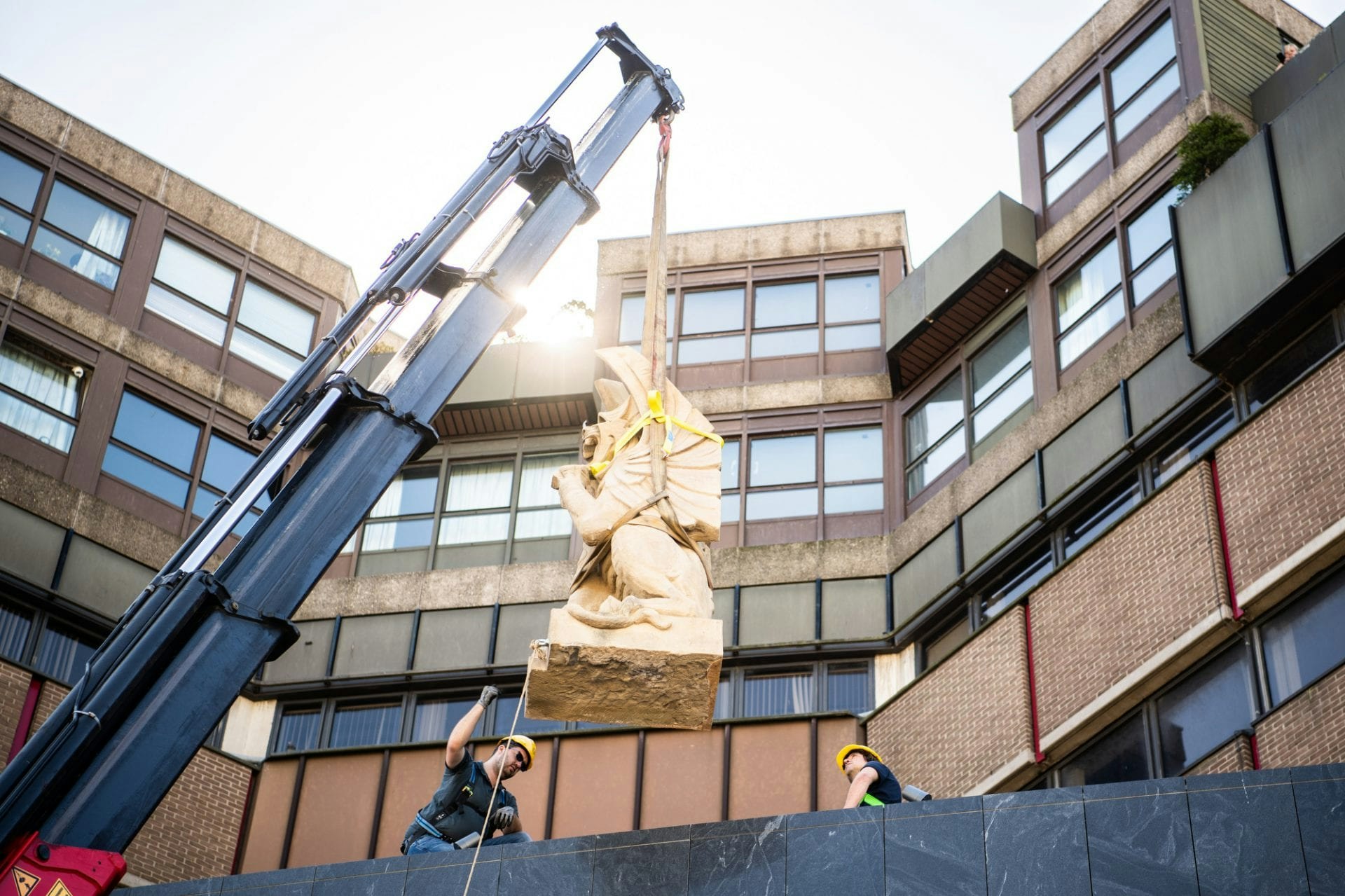 Op de gloednieuwe, moderne gevel van winkelcentrum Hoog Catharijne zijn twee historische chimaera’s geplaatst. De beelden stonden van 1901 tot 1974 op het gebouw De Utrecht. Nu hebben ze weer een plek in het centrum van de stad.