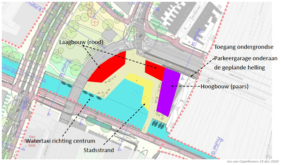 Volgens Capelleveen is de hoek bij het Park Plaza Hotel hier perfect voor, maar dit wordt niet in de huidige plannen benut. In de eerste schets die hij heeft gemaakt is een plein met een waterspeeltuin en verschillende horecazaken te zien.