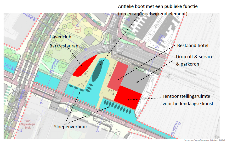 In zijn tweede voorstel heeft hij een stadsstrandje getekend en nieuwe gebouwen met horeca op de begane grond. In de derde schets is een haven te zien waar een antieke boot met een publieke functie komt te liggen.