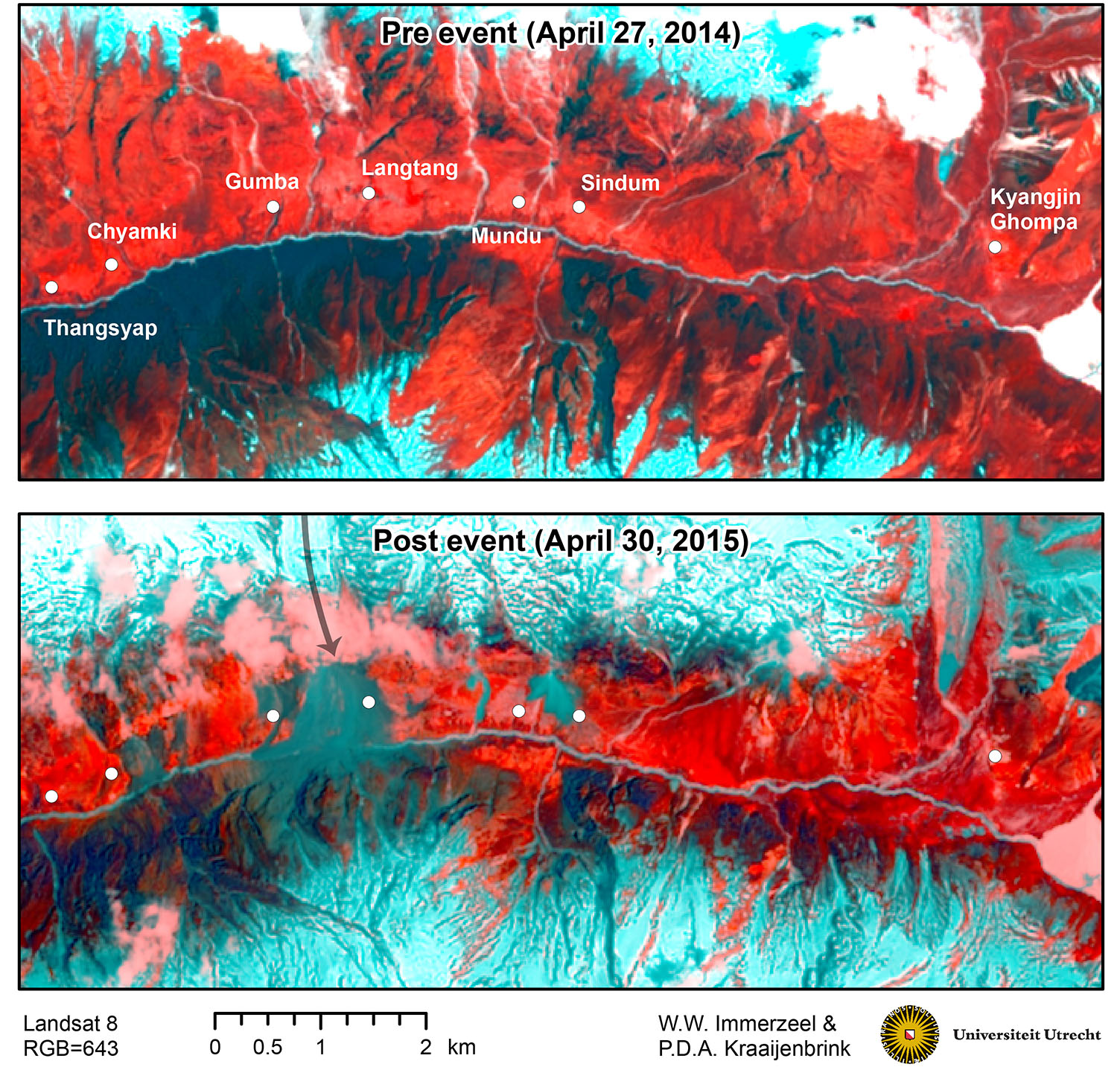 Universiteit Utrecht laat weten dat op de satellietbeelden te zien is dat het dorp Langtang volledig is bedolven onder sneeuw, ijs en puin. Bij de dorpen Chyamki, Gumba, Mundu en Sindum zijn grote landverschuivingen en lawines te zien. De onderzoekers zoeken systematisch het hele bevingsgebied af, zodat eventuele verdere rampen, zoals meervorming, modderlawines en doorbreken van gletsjermeren, voorkomen kunnen worden. Ook hopen de wetenschappers met de resultaten reddingsacties te kunnen ondersteunen.