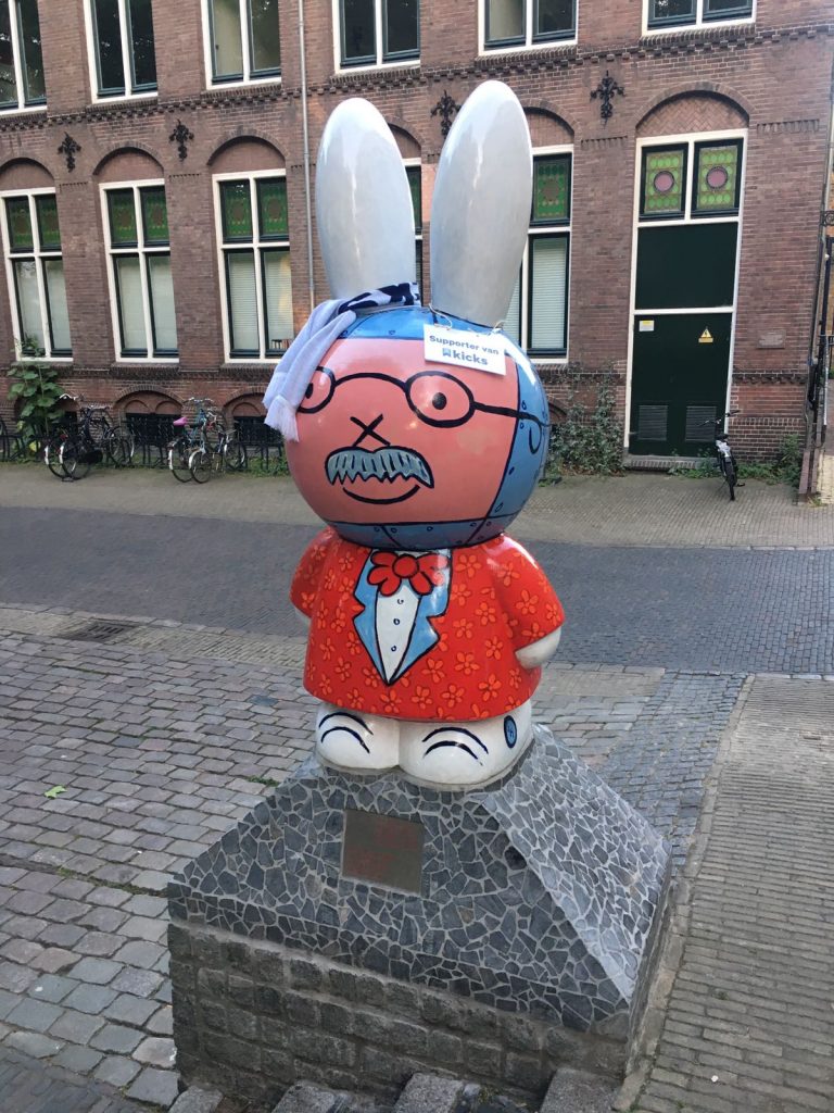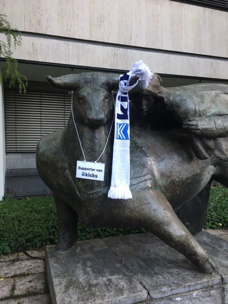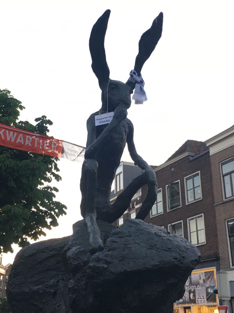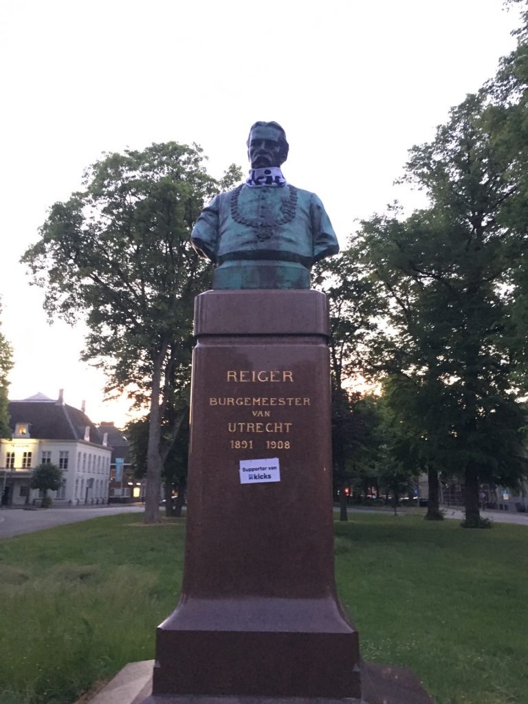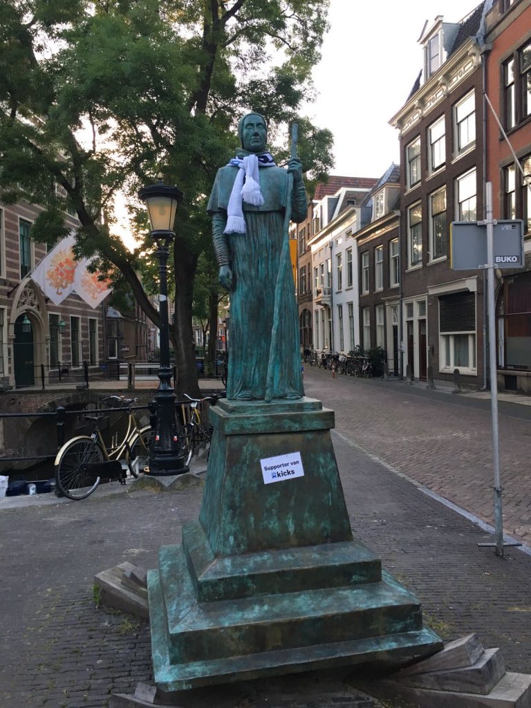 In Utrecht zijn vannacht meerdere beelden behangen met sjaaltjes. De beelden kregen ook een bord omgehangen met ‘Supporter van Kicks’. Welke organisatie achter de sjaaltjes zit is niet bekend gemaakt.