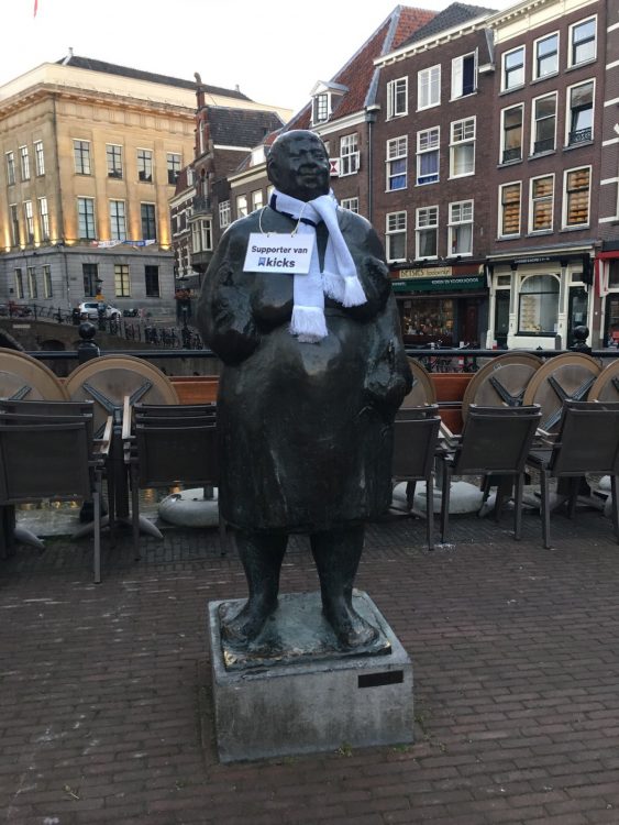 In Utrecht zijn vannacht meerdere beelden behangen met sjaaltjes. De beelden kregen ook een bord omgehangen met ‘Supporter van Kicks’. Welke organisatie achter de sjaaltjes zit is niet bekend gemaakt.