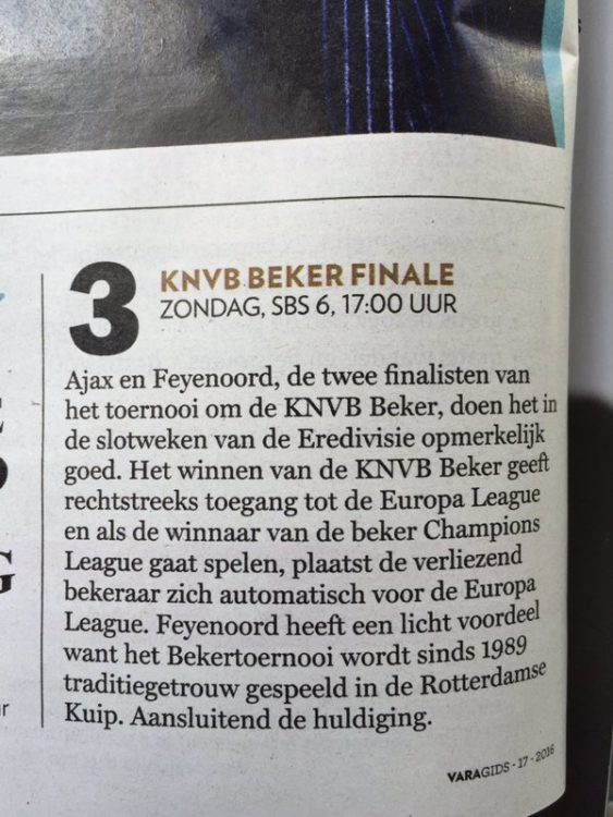 Een opmerkelijke tip in de VARAgids van deze week: de bekerfinale tussen Ajax en Feyenoord van aanstaande zondag. De publieke omroep raadt aan om zondag op tijd de tv op SBS6 te zetten om beide ploegen die het de ‘laatste weken opmerkelijk goed doen’ aan het werk te zien.