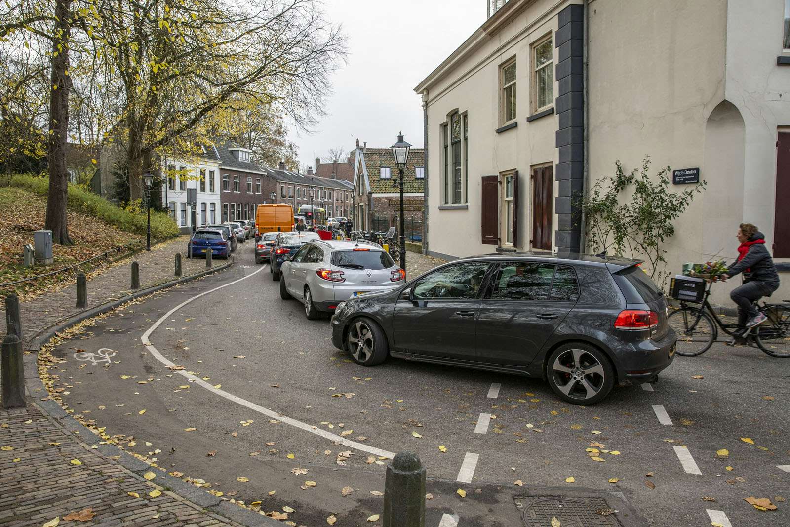 Om vanaf de Wijde Doelen de stad uit te rijden moeten automobilisten linksaf de Tolsteegbrug over. Het verkeer wat uit de Tolsteegbarrière komt en via dezelfde weg de stad uit wil heeft dan voorrang.
