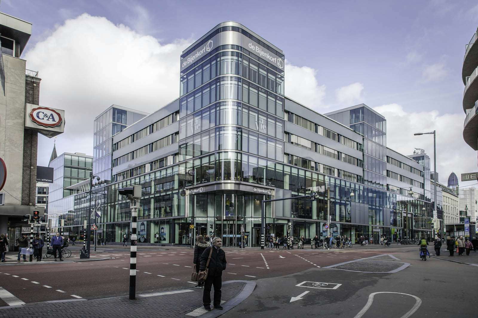 Waar zijn de monumentale lantaarnpalen gebleven die op de oude Bijenkorffoto staan?