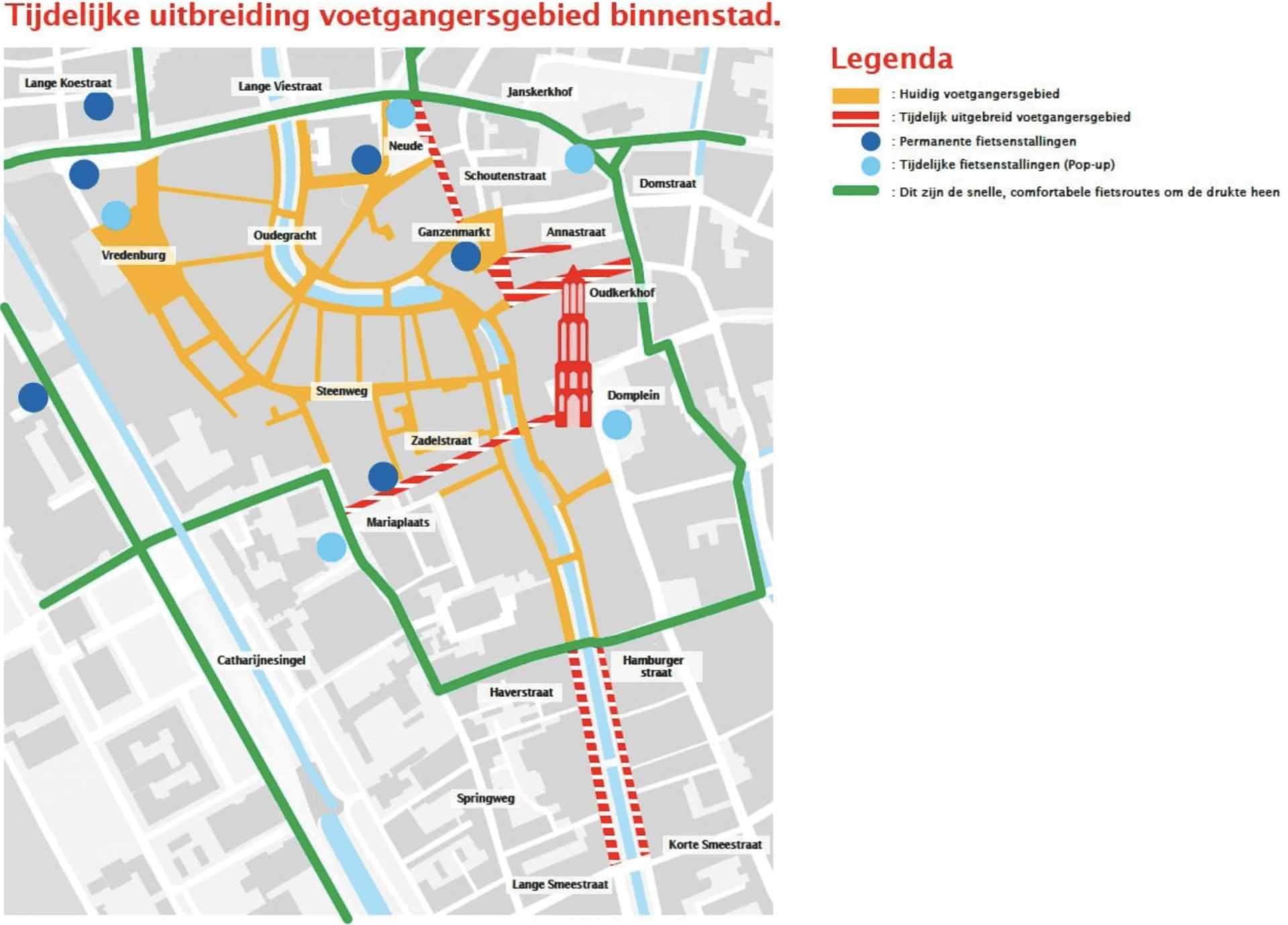 Sinds 27 juni 2020 is het voetgangersgebied in de binnenstad tijdelijk groter zodat bezoekers zich beter aan de anderhalvemeterregel kunnen houden. Grotere stukken van de Oudegracht, maar ook de Zadelstraat, Schoutenstraat en Oudkerkhof zijn regelmatig afgesloten. Net als in het oorspronkelijke voetgangersgebied mogen hier tussen 10.00 en 18.00 uur alleen voetgangers komen. Fietsers en automobilisten zijn niet welkom.