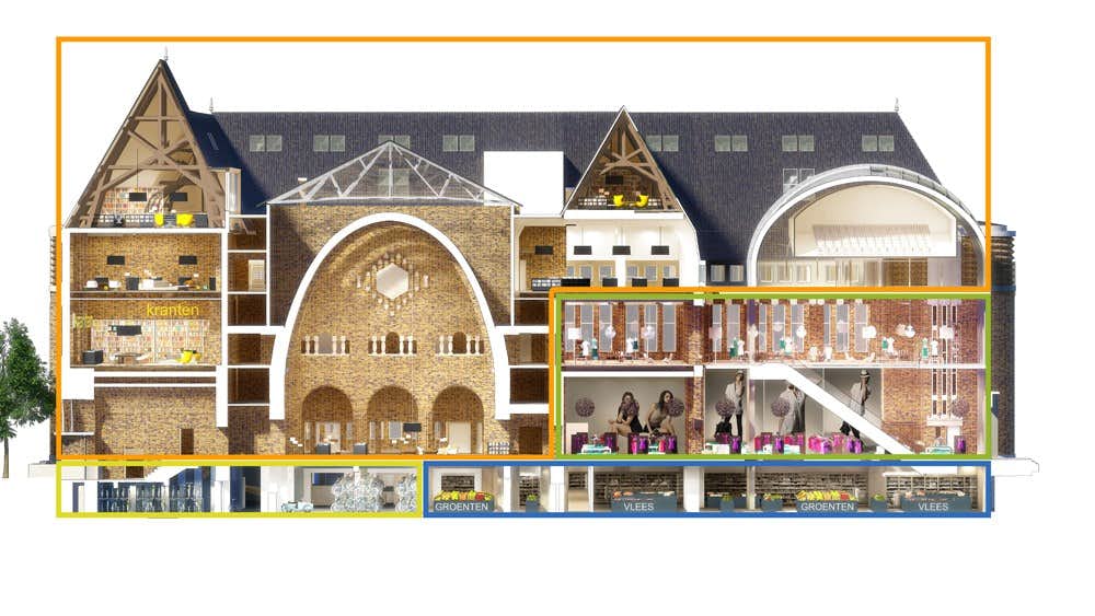 In het souterrain van het pand komt een grote foodmarkt. Hier kunnen mensen niet alleen wat boodschappen doen maar staat ook de beleving centraal. Zo bereiden chef-koks maaltijden en kan er ter plekke gegeten en gedronken worden. De ingang van de foodmarkt komt aan de Potterstraat.