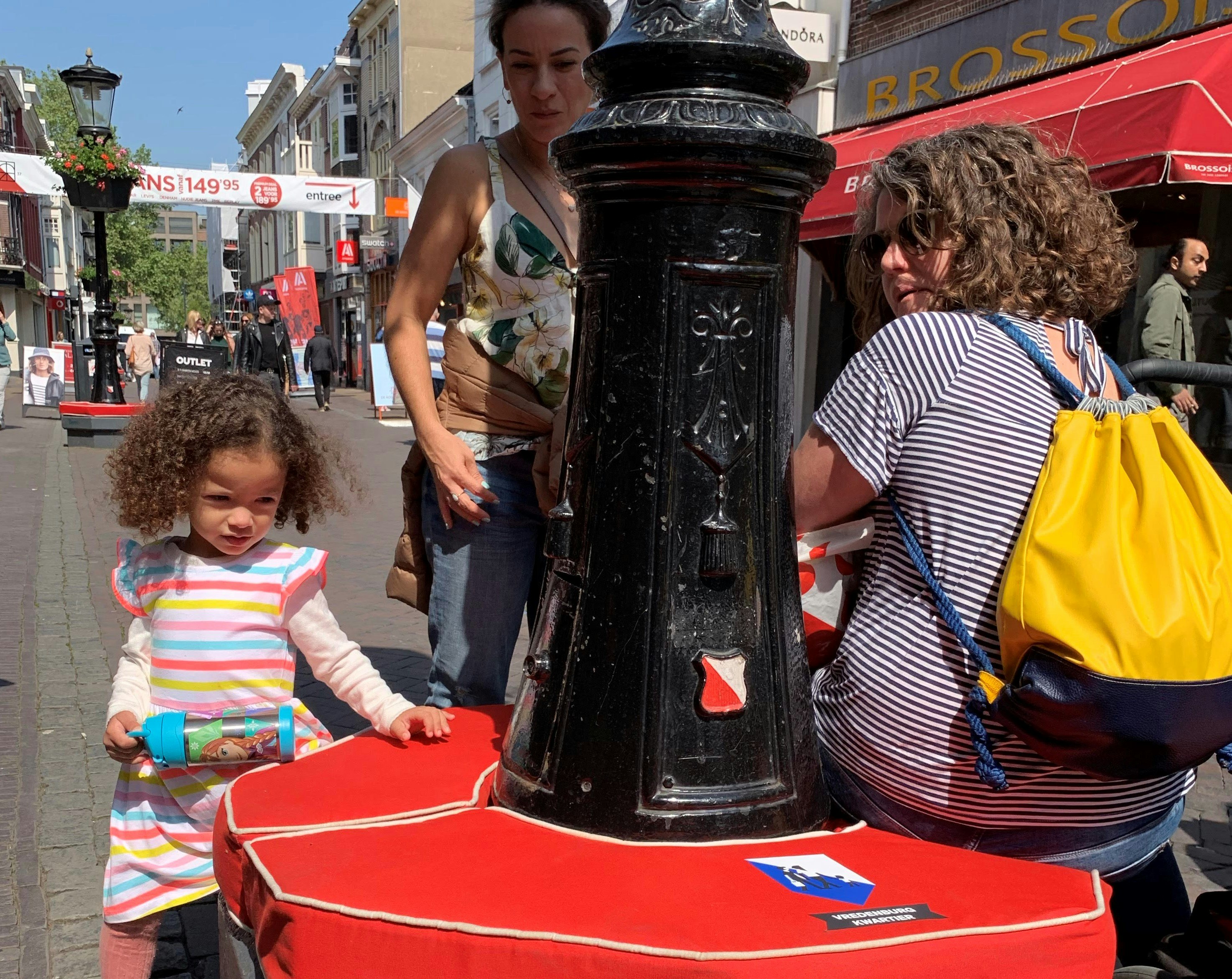 Het winkelend publiek van van de Lange Elisabethstraat in Utrecht kan vanaf vandaag uitrusten op comfortabele zitplekken. De voet van elke lantaarnpaal in de drukke winkelstraat is vrijdigmiddag voorzien van een rood zitkussentje.