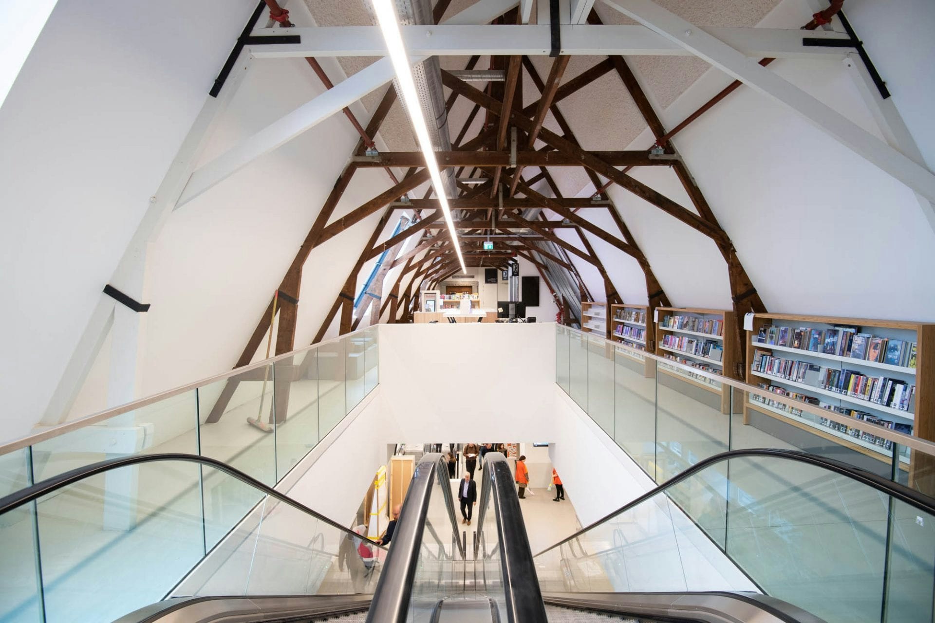 De bibliotheek ziet er prachtig uit, complimenten. En mooi dat de centrale hal nog zoveel karakter heeft behouden.