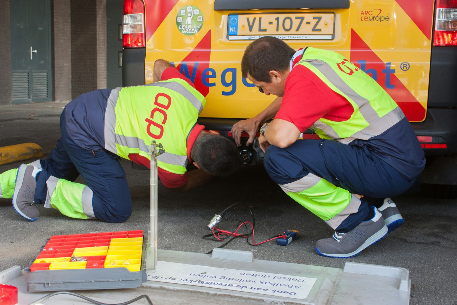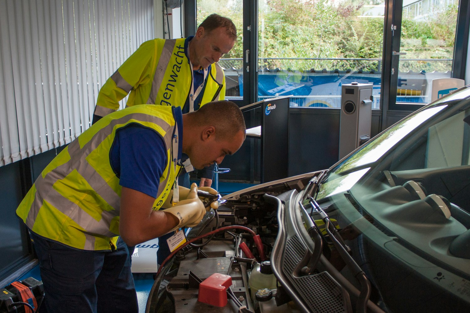“We’ll do our best to get inside of the car and fix the problem”, wegenwacht Stemmer kalmeert de chauffeur. Samen voeren Stemmer en El Mansouri de opdracht snel en zorgvuldig uit. “Zoals je ziet hebben de Nederlandse mannen de kabel losgekregen, met de juiste handschoenen en veiligheidsmiddelen. Ze hebben netjes alles afgezet zodat mensen niet te dichtbij komen”, zegt technische trainer Van Broekhoven.