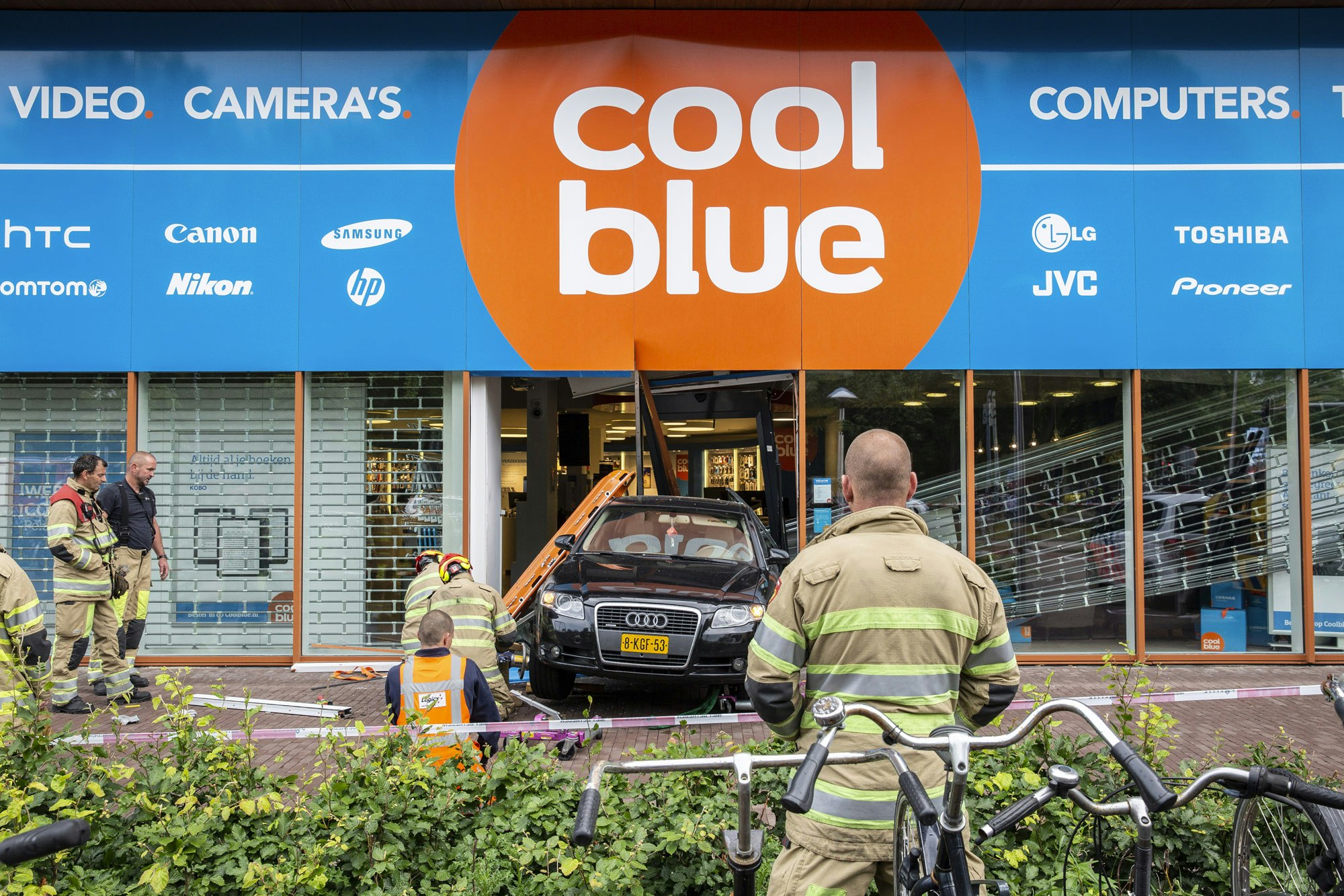 Een zwarte Audi boorde zich bij de elektronicawinkel aan het Europaplein in Utrecht naar binnen. Rondom de winkel lagen smartphones verspreid op straat. Enkele tientallen meters verderop lag de groene scooter die is klemgereden.